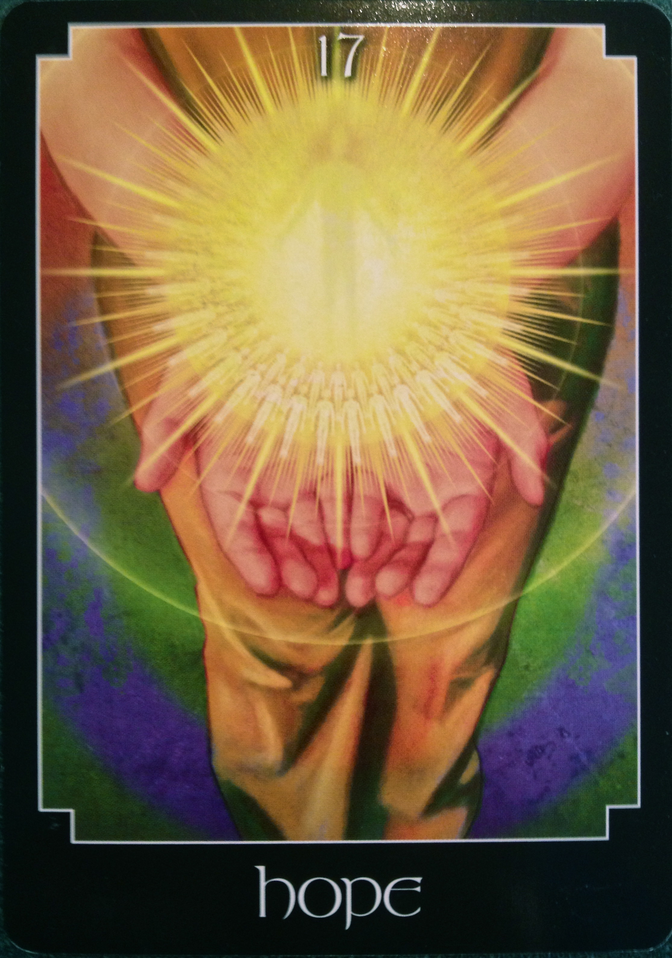 “This is a card that focuses on the qualities of hope, faith, healing, aspirations, success, and finally, enlightenment. When this card appears, know that a special wish you have made may be fulfilled in time. The Hope card will help show you that the impossible can indeed become the possible. The force that works through your soul – determining what is possible and the difference between success over failure, and above all, who we are – is the power of your belief.