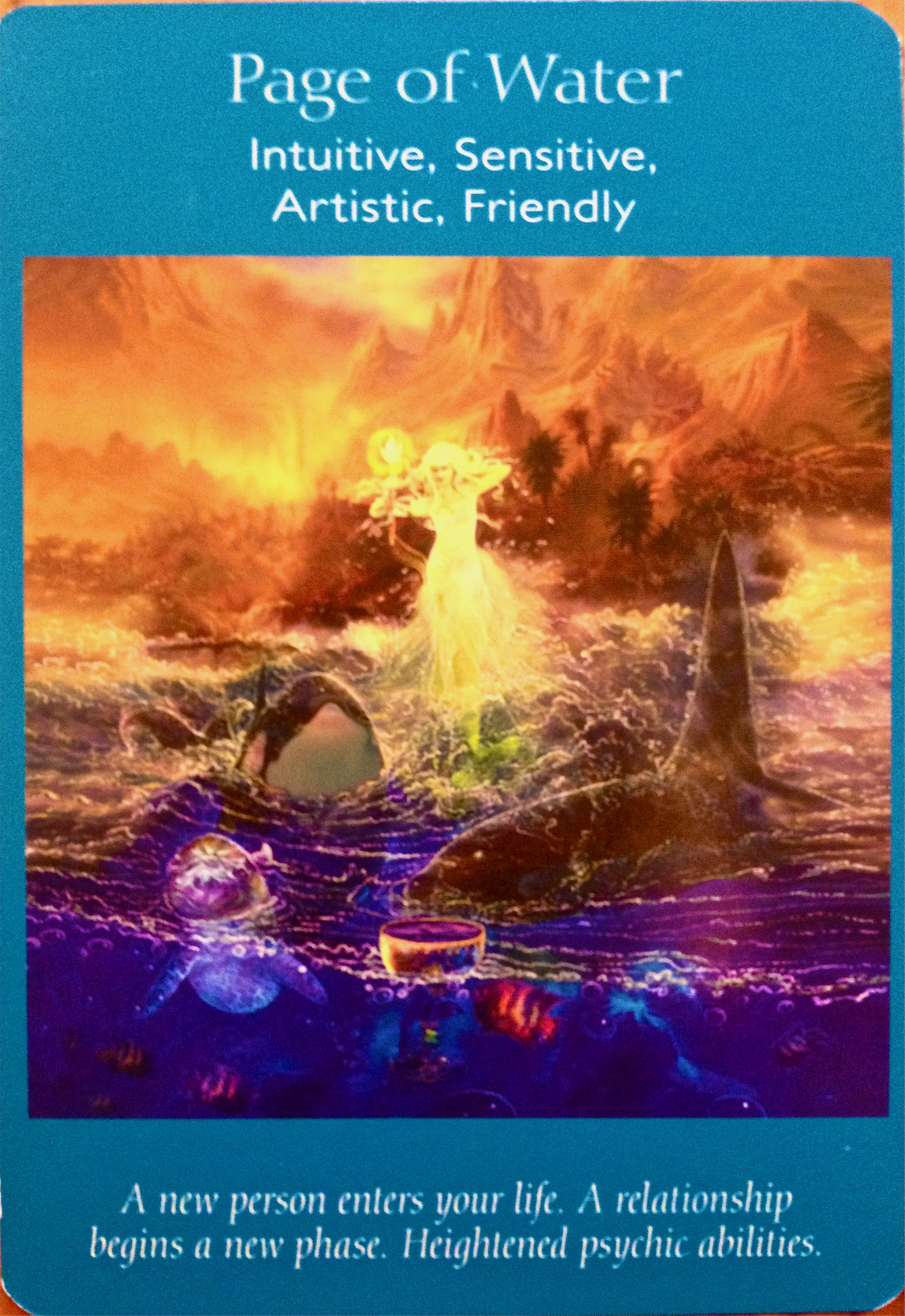 Page of Water: “A new person enters your life. A relationship begins a new phase. Heightened psychic abilities.”