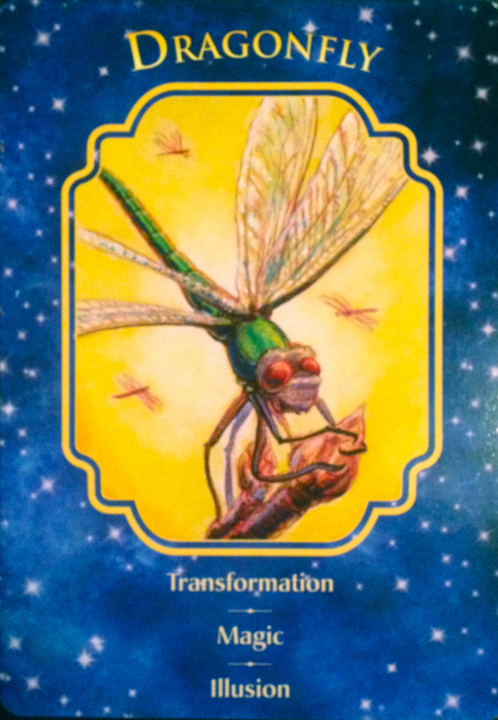 “This card is reminding you to use creative imagination as a force within your life. It can transform your world! When you utilize your mind in this manner, you are actively expanding yourself psychically. Do not allow illusion to hold you back. Know that nothing is permanent or set in stone. You can change your life. Dragonfly, weaver of dreams, is the symbol of transformation and new visions.