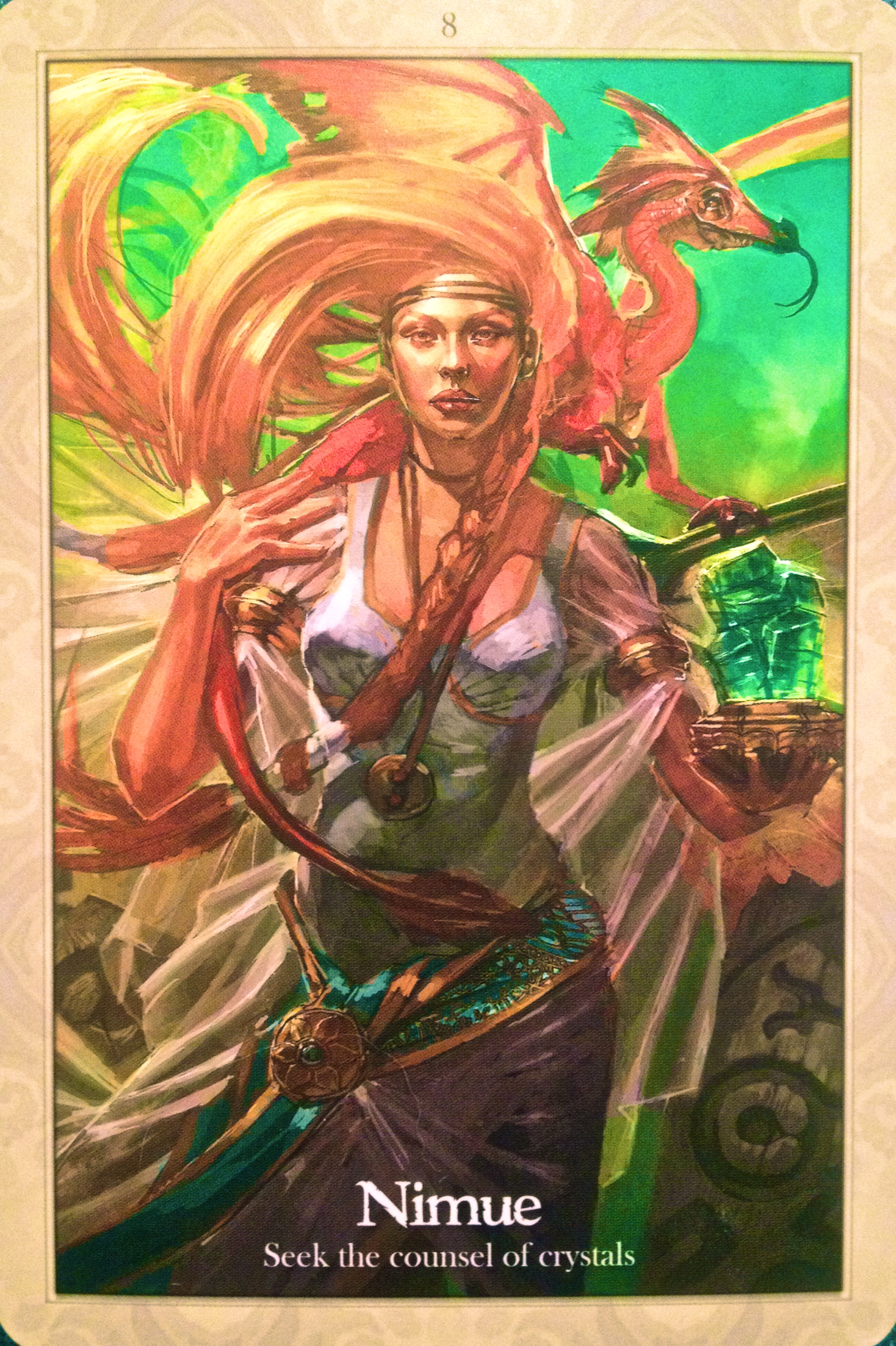 Divinatory Meanings: “It is time for you to free yourself from the confines of others expectations and investigate other less conventional ways of making a living. You may be drawn to a particular crystal at this time, and may enjoy simply entering into more regular communion with the element of earth and its minerals. Wear jewellery that has been cleansed by you, and energized by you, and understand its significance and power for you. Make each piece you choose to wear a totem symbolizing your own self, adorning and expressing who you truly are. Above all, the message of Nimue is to free yourself. Stop expecting others to unshakle the chains and force you to walk free. You, and only you, can remove that which is holding you back.