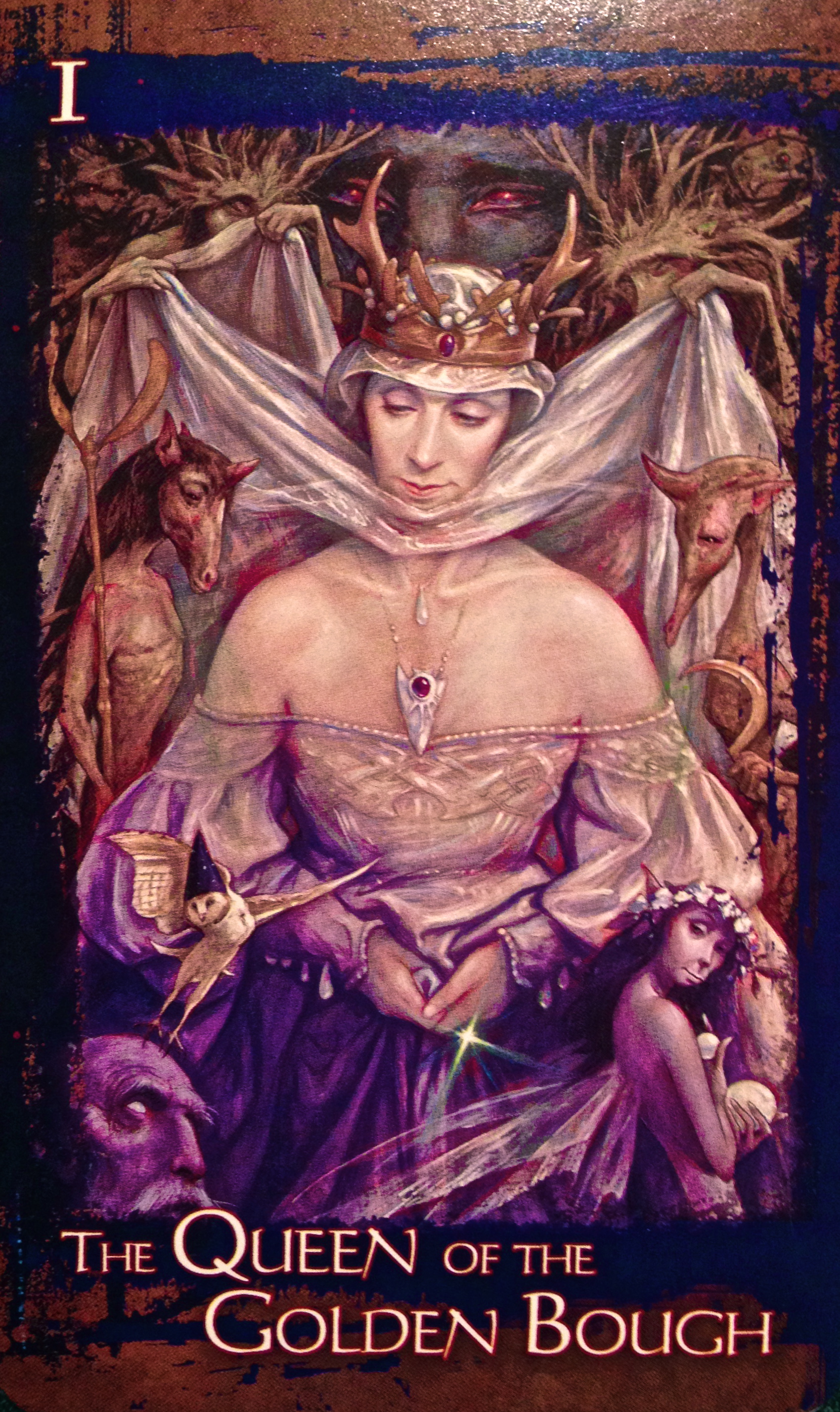 “This is the queen of all things spiritual, of healing, and of transformation. If you choose The Queen Of The Golden Bough, you are calling on the help of one of the true healing spirits of Faerie. You are seeking healing on a very ancient and fundamental level. Your need to heal and change may be so deeply embedded in your psyche that you may not even know it is there. This queen calls for the healing of “world” sorrow, and the sorrow that wells up inside of you without having a specific cause that you can pinpoint. Listen to what The Queen Of The Golden Bough has to tell you. She asks you to let go and allow her healing presence to nurture you. When you feel an overwhelming sadness that takes you by surprise, a sadness that seems to spring from the depths of your soul, meditating on this card can help you rebalance your emotions. It may also be time to let go of emotions that are stopping you from healing. These may be emotions that have a more tangible cause but still overwhelm you at surprising times.