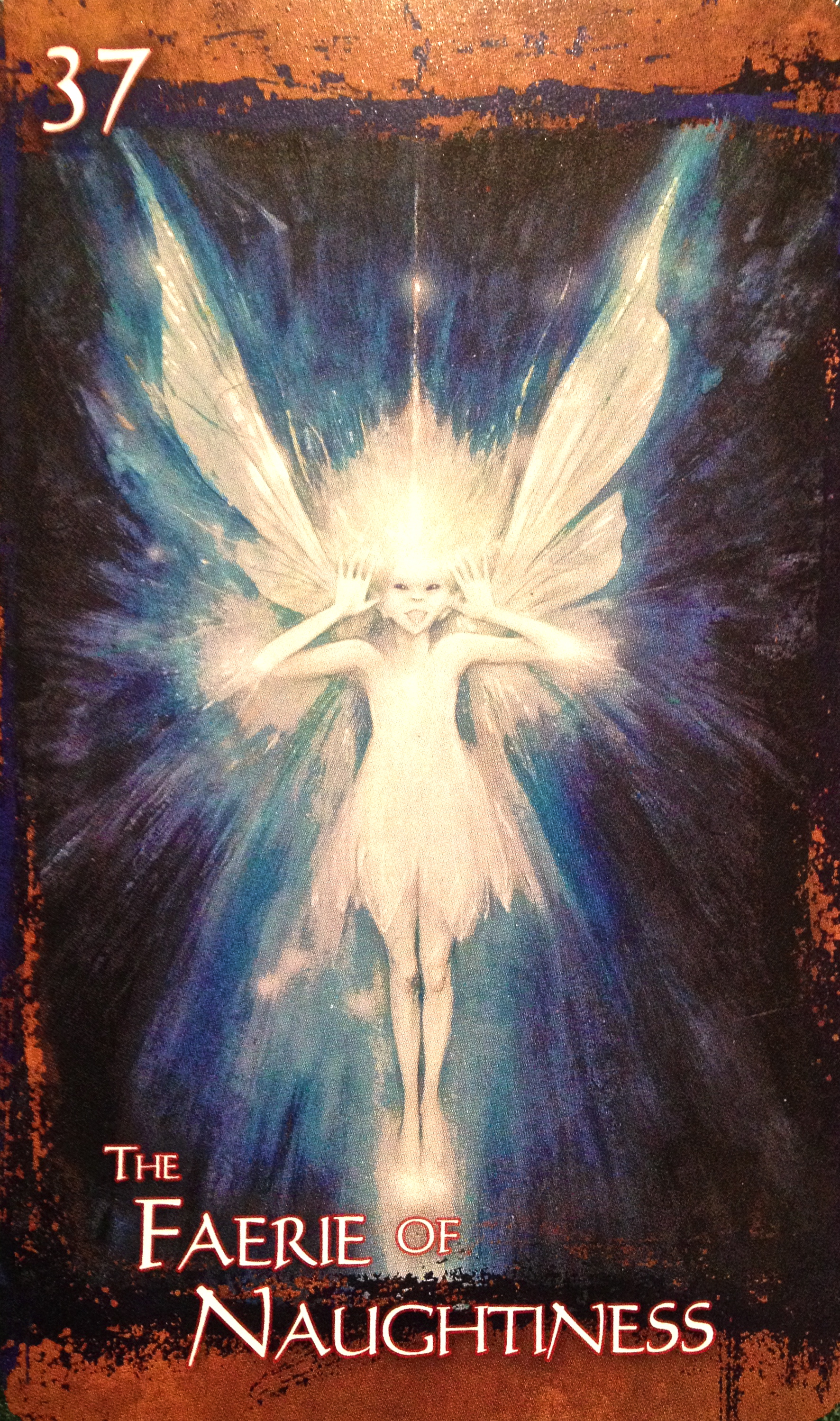 “Sometimes you just have to be naughty. Now being naughty is not being bad. Being naughty can be a wonderful release. The Faerie Of Naughtiness asks you to step outside of your boundaries for a moment and do something unexpected. She dares you (well, you can see that by the way she is looking at you) to change the energy of a situation by doing the one thing that will tilt the Universe just a tiny bit. Sometimes you can change that energy just by thinking. Naughty thoughts can lighten a situation without anyone else having to know about it. As you look at her, I am sure an idea will come to mind.