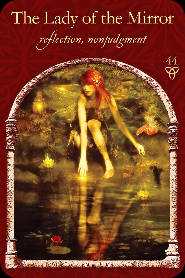 The Lady of the Mirror asks that you honour every part of your story as essential to your highest unfolding. Can you see yourself as being exactly where you need to be on your path? Do you love what you see in the mirror? Can you perceive your part in your reactions and the motives behind your current inquiry? You will find your answer in a thorough and honest self-appraisal.”*