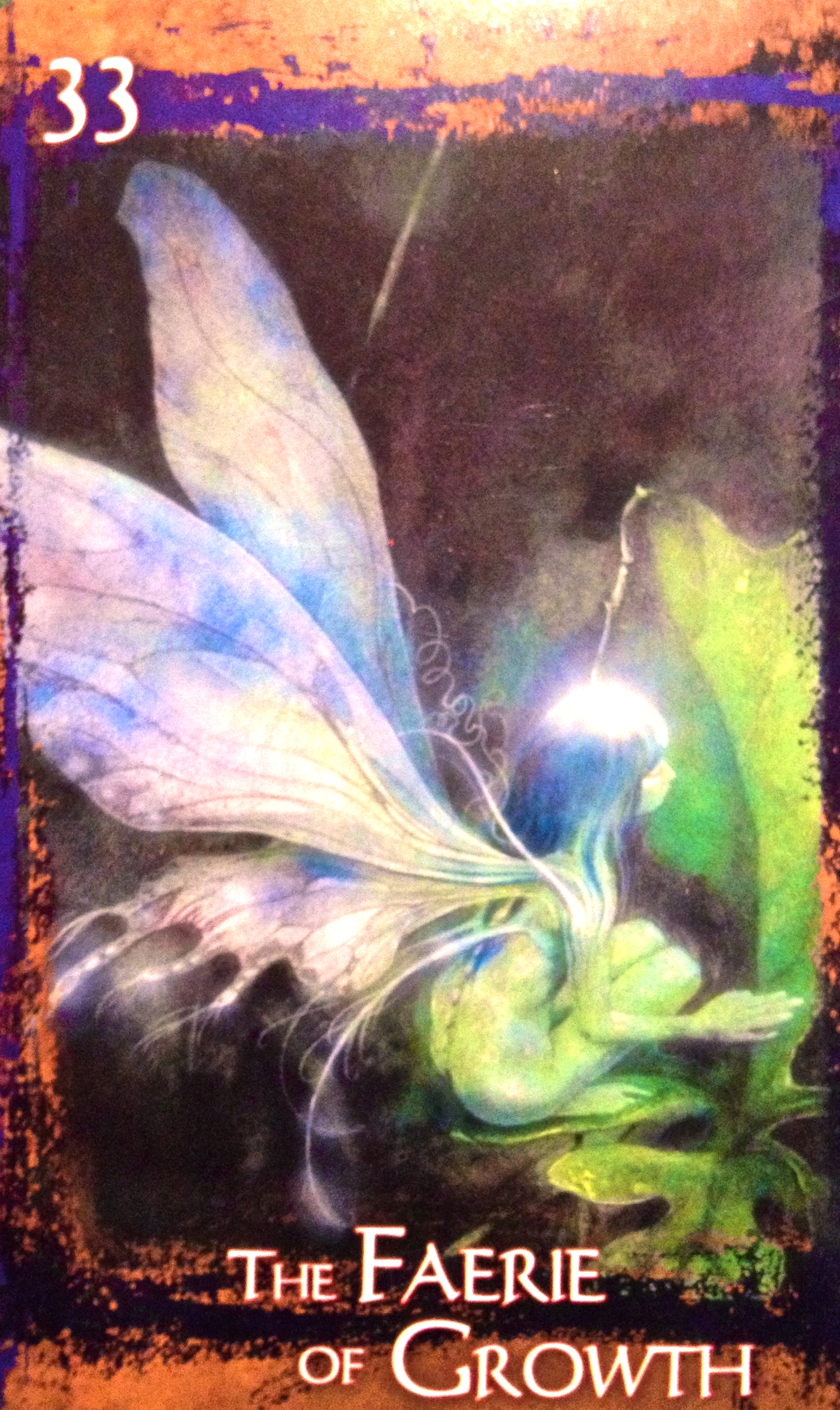 “Look at her, sitting on a young green leaf like a bud just opening into full flower. This is the Faerie of Growth. Growth can mean so many things. One thing it always means is movement and change. Growth does not stand still. Growth by its very nature is a constantly changing process. To stay in one mindset or one mode of being is to stagnate. If you move through life with an awareness of everything around you, you will grow. You will not be able to help it. If you draw this card, take the time to think about how your life is changing and how you can direct that change for the good. If your life seems to be stagnant, then this card is especially helpful for you. Look at the Faerie of Growth and feel the energy of her unfolding wings. She is just about to take flight and discover a new adventure. You can take flight, too. You do not have t fly far or explore distant lands, you just have to take as step forward and see where that step leads you. So spread your wings and grow.”*