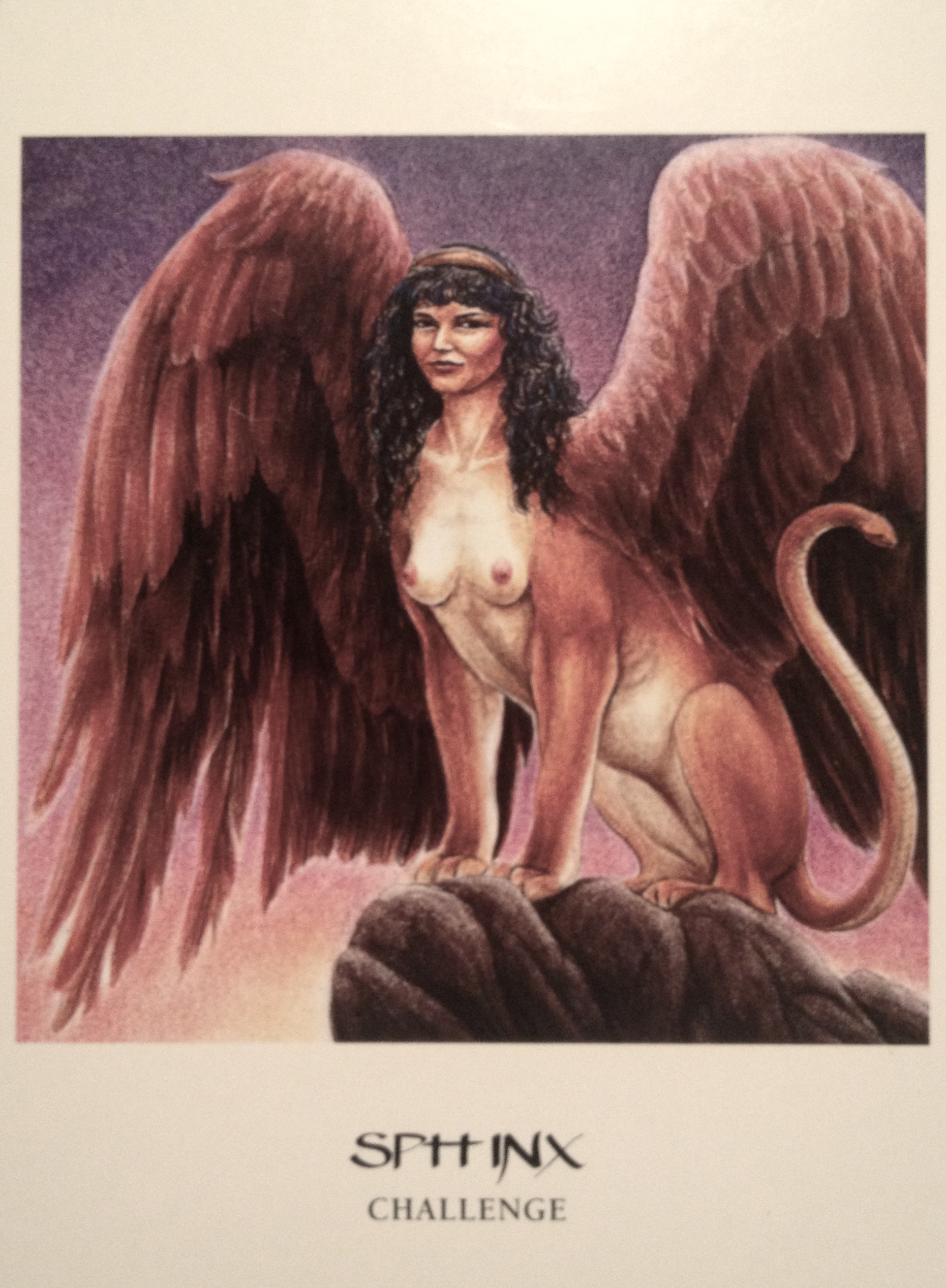 Mythology: The sphinx appears in Greek mythology as the monster – a woman’s head and breasts, a dog’s body, lion’s paws, wings of an eagle, and the tail of a serpent – who questioned Oedipus. To the ancient Egyptians, she symbolically represented the Nile and its seasons. She was also a manifestation of Hathor, Goddess of birth and death. The Sphinx of Egypt was built as a guardian of the horizons, the rising and setting of the sun. It held the keys to the wisdom gates. In the path to deep knowing, initiates has to confront the challenges that the Sphinx posed.