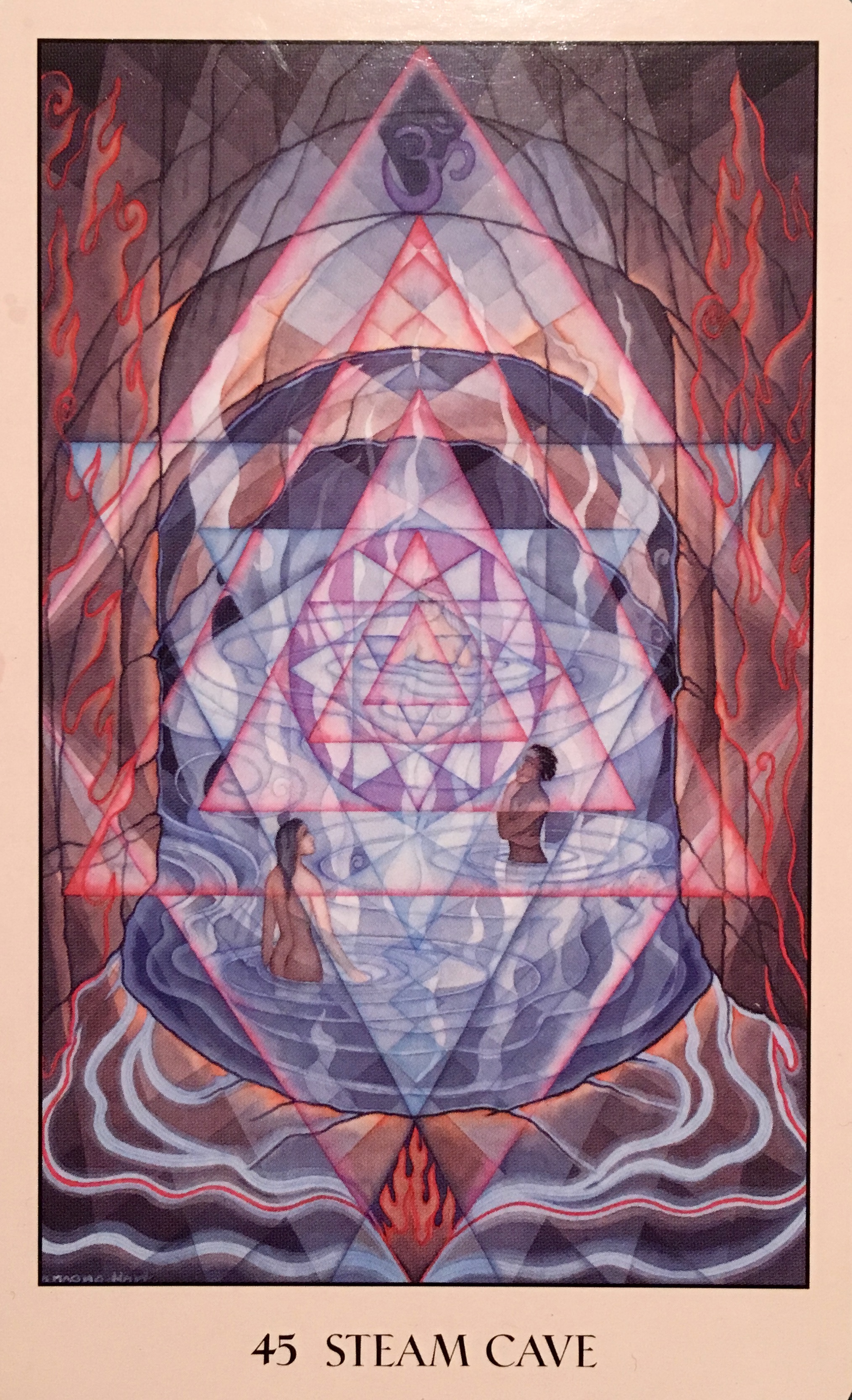 “This card speaks of connecting with elemental forces. The geometry here is of triangles and star tetrahedrons. The illustration was inspired by a hot springs steam cave in which the bather sits in medicinal waters inside the earth and listens to the pulse of the planet as the springs ebb and flow and gurgle. There is a womb like feeling within this cave in the earth, where fire heats water into steam.