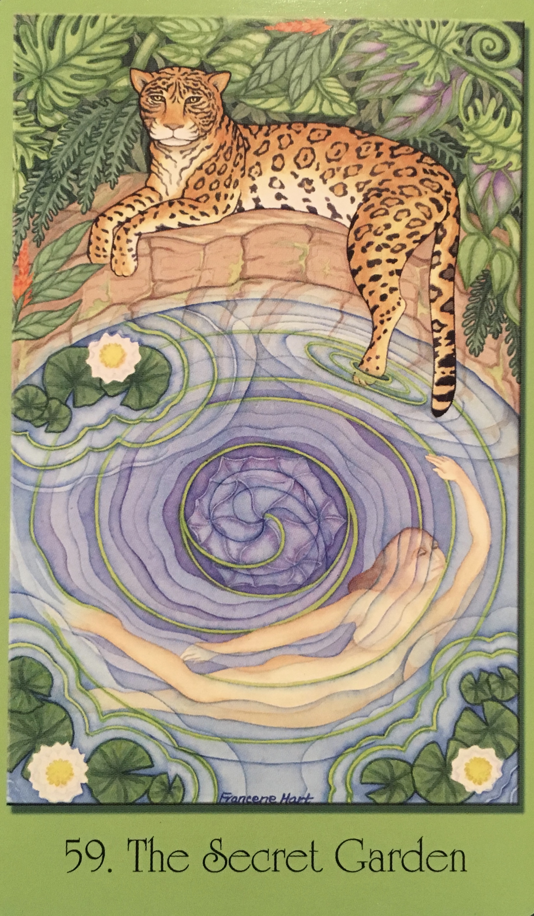 You are invited to enter this secret garden through the water. Feel safety, peace, and serenity as you swim in spirals and float at the water’s edge. A geometric vortex lies in its center activating the vitality of this card. Climb out of the pool and relax with this beautiful jaguar. He will protect you and guide you to your own truth. In this safe place you can even cuddle up with Jaguar, empowering yourself and facilitating soul work.