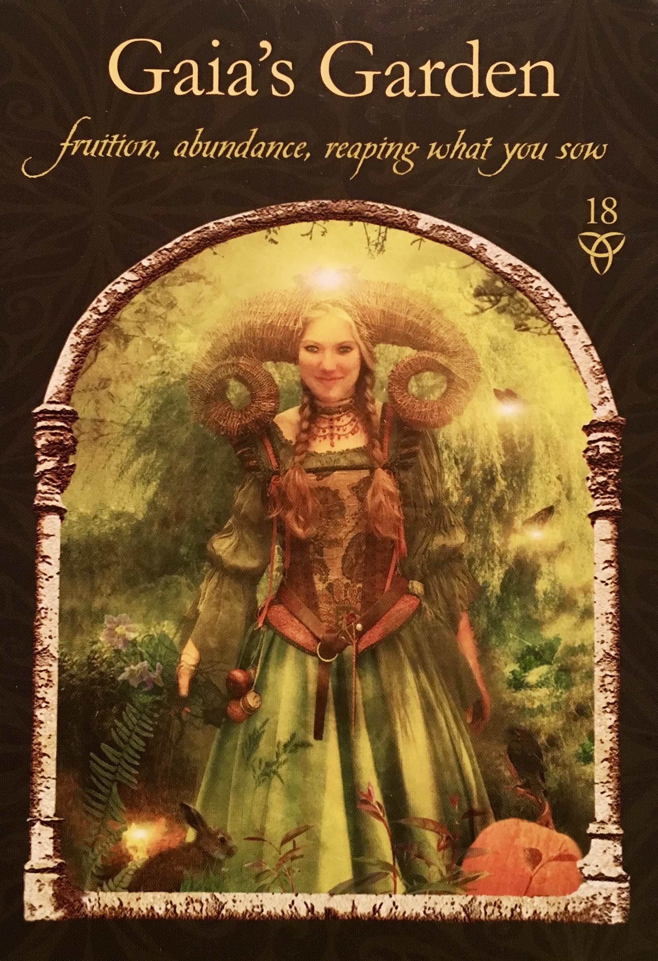 “In Gaia’s Garden, you have everything you need to make your dreams come true. There is no shortage of anything, and you are constantly reminded of the Law of Supply. Gaia is the infinite Spirit manifest in all tanglible things. She represents the abundance of Nature. When she comes to you as your Ally, she invites you to partake of all the blessings of Life. There will always be enough for everyone. Success comes to you from the fruits of your intentions, and all is well with the world as a result.