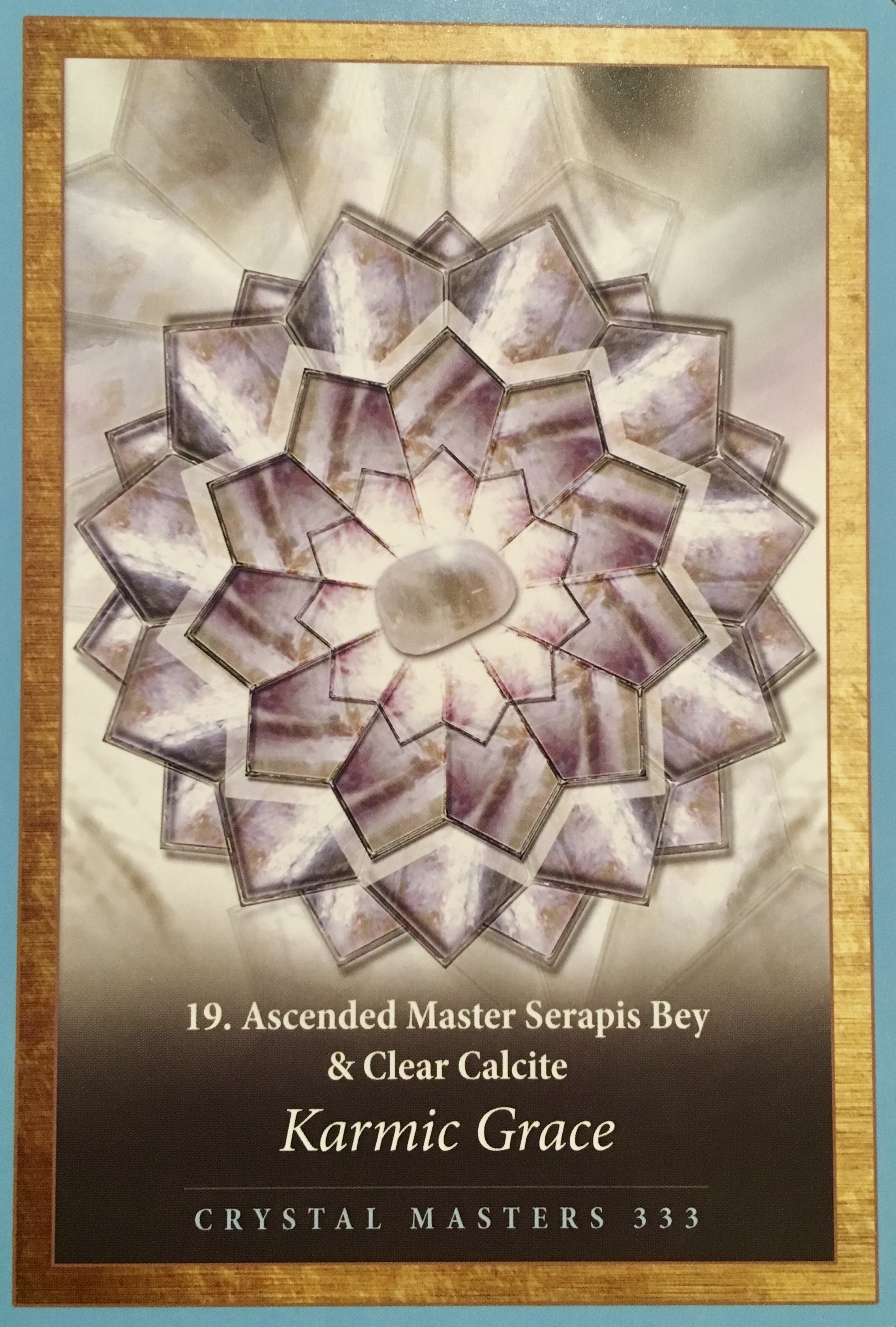 ‘I call upon the Ascended Master Serapis Bey and the Crystal Angel of Clear Calcite who love me unconditionally. Thank you for the divine healing blessing of karmic grace. I surrender with relief and loving trust into my life experiences now. The struggles and the easier times serve me perfectly. I do not resist. I use my free will to move through every experience offered, even when it doesn’t make sense to me at the time. I accept the gift of karmic grace. May that grace bless the lives of all living beings. Through unconditional love and my own free will, so be it.'”*
