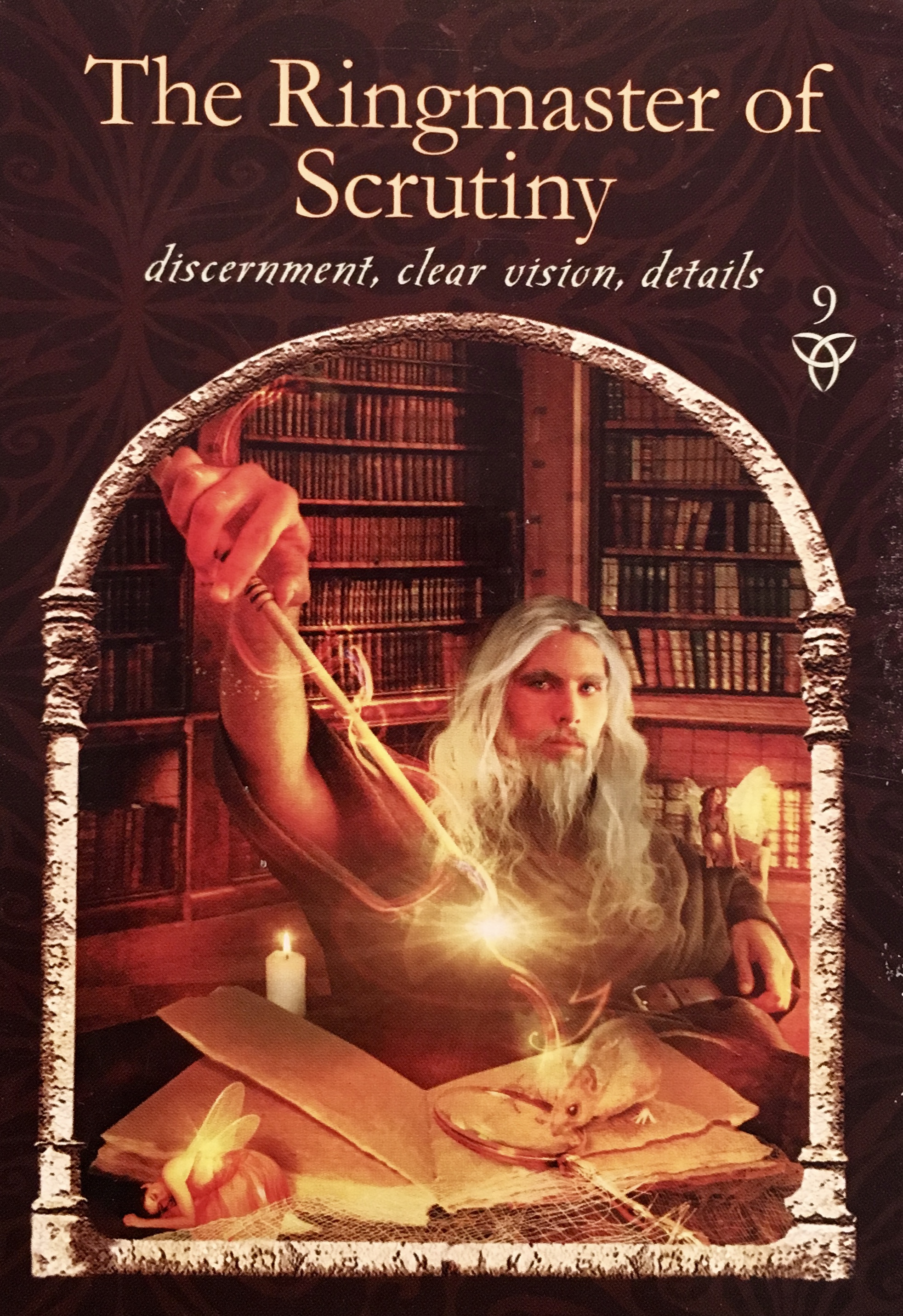 The Ringmaster Of Scrutiny as Challenger: “When The Ringmaster Of Scrutiny appears as your Challenger, he warns you to observe your situation with discernment and clarity. It is time to see the flaws in the foundations you and others have built under you. It also seems that you may be getting caught up in the details of your dream when really it is time to leave them to the Divine. Perhaps you are worrying about the past and the future too much, forgetting that the dream is created in the Now time. Often the Ringmaster Of Scrutiny also brings a warning to read the fine print and to watch out for hidden agendas when you are involved with others.”*