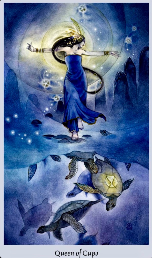 Queen Of Cups: “The very being of the Queen Of Cups is a creative nexus. She is poetry in motion, imagination incarnate. She can dance upon the swells of the ever-shifting, ever-changing seas in unison with the dance of life that engages all of the world and its creatures around her.
