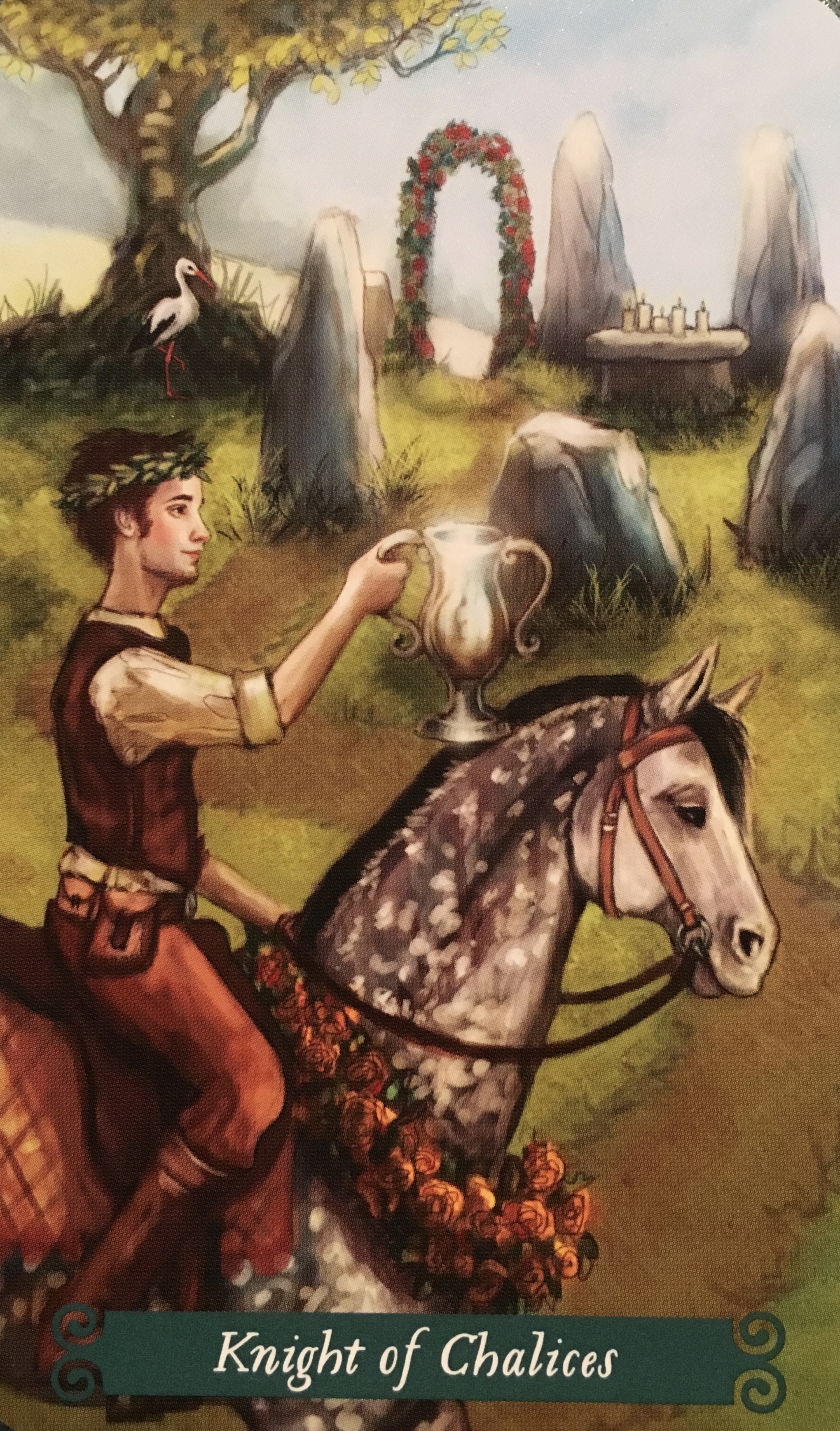 Daily Angel Oracle Card: Knight Of Chalices, from the Green Witch Tarot Card deck, by Ann Moura, artwork by Kiri Ostergaard Leonard