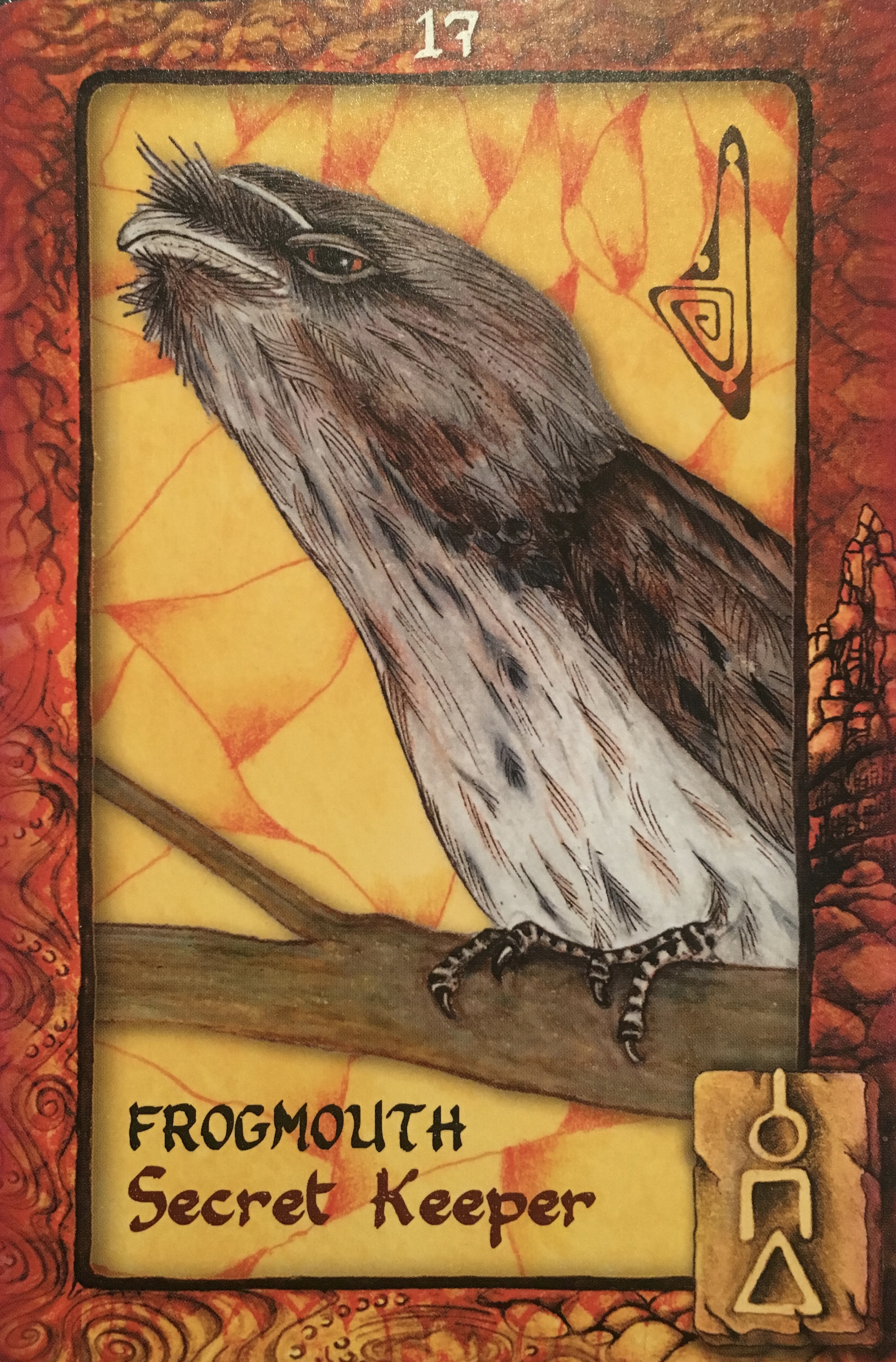 If Frogmouth has appeared in your cards, you are being encouraged to seek out the secrets being held in trust by your Elders. Approach them with respect and ask them to share their sacred knowledge. Ask questions about their history, their childhood and the way of their generation Inquire as to what life was like for them, how they interacted with their peers and kin and the responsibilities expected of them by their seniors. Speak of chores, education and wars, of times spent at school, of love, fashion and economic flow.
