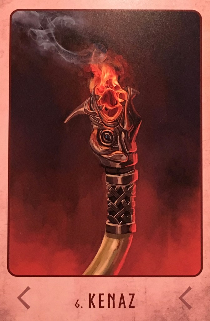 Kenaz as Challenger: “Someone around you may be jealous of you, worrying that you will surpass them in some way. Remember, great teachers want their students to surpass them. Alternatively, at this time, you may be unwilling to admit to or examine your own shadows. The Vikings understood that to think we exist in perfection, that we live entirely in the light, with no darkness, is to be in the grip of delusion.”