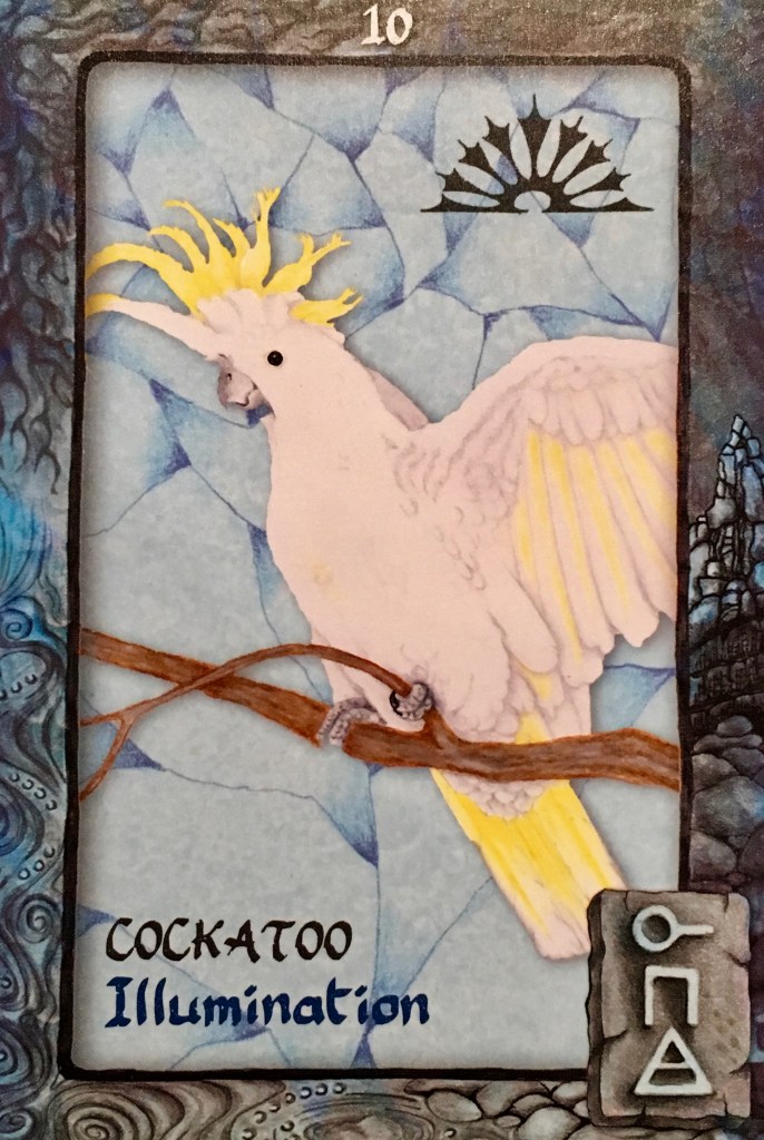 Daily Angel Oracle Card: Cockatoo ~ Illumination, from the Animal Dreaming Oracle Card deck, by Scott Alexander King, artwork by Karen Branchflower