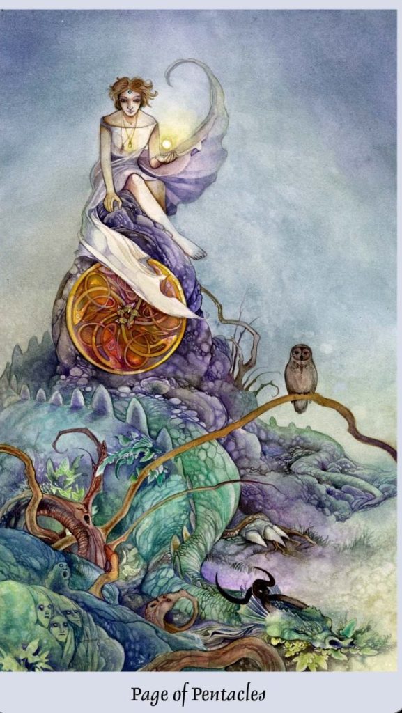 Page of Pentacles: “Opportunity slumbers like the dragon upon whose crest the Page of Pentacles rests. Dreams and visions vibrate along its emerald length. They rise up through the soles of the feet of any who tread upon that viridian path, transmitted from the leviathan’s sleeping mind – dreams of success and of being able to possess material comfort and stability. She knows those visions that the dragon offers – a wondrous garden of delights. She is the keeper of that garden, dedicated to it’s preservation.