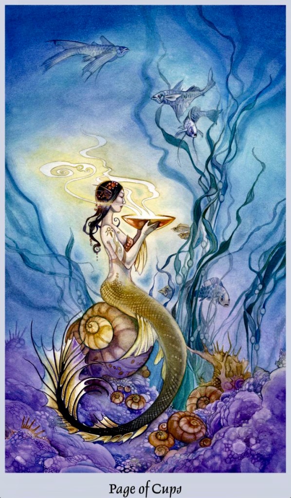 Page Of Cups: “She delves down through the waves, seeking to be alone and to find a peaceful place to contemplate her own thoughts.