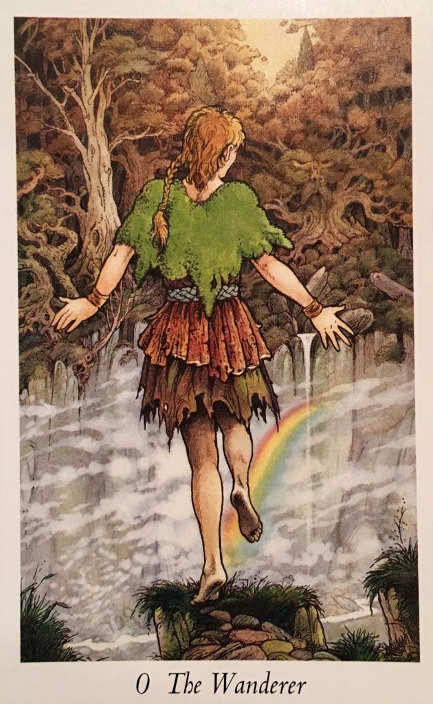 Card Description: “Poised on the edge of a while chalk cliff, the Wanderer prepares to step across the abyss and into the Wildwood beyond. Ahead lies the faint suggestion of a rainbow arch, onto which the Wanderer must step. This leap across the void is greeted with open arms and a deep trust that the wings of imagination and honesty will carry the figure onto the lush green turf of a new path.