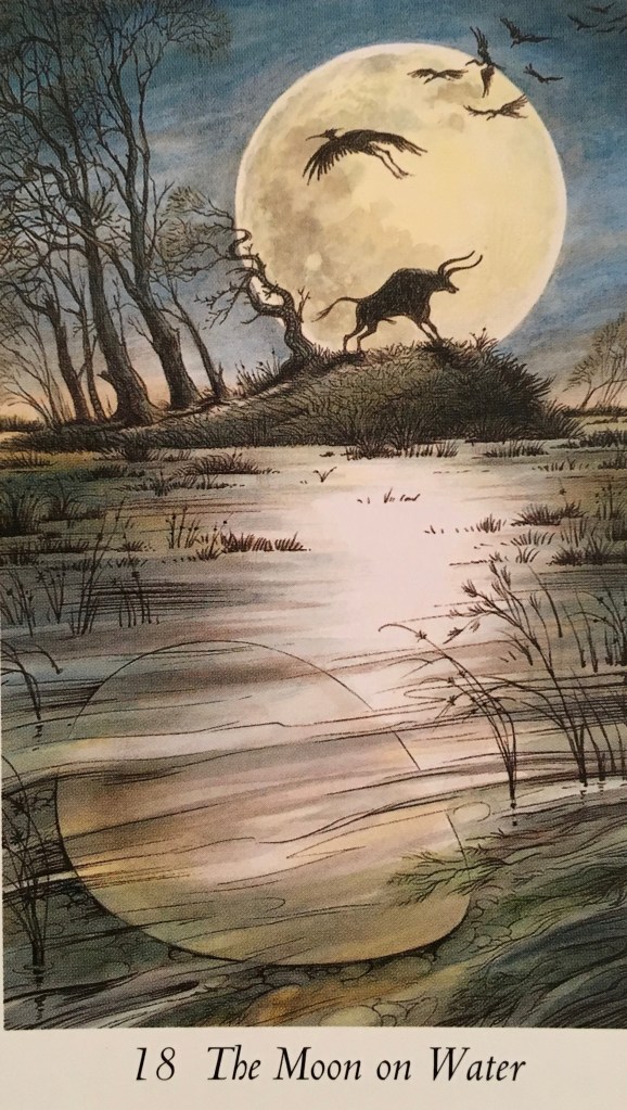 Position on the Wheel: “The Moon On Water is placed at the womb of the Wheel, the Midwinter Solstice on 21 December and the dark sun. It’s element is Earth and it is at the gateway of the soul. It is the mystic still point where ideas and desires change from pure thought to objective reality.”