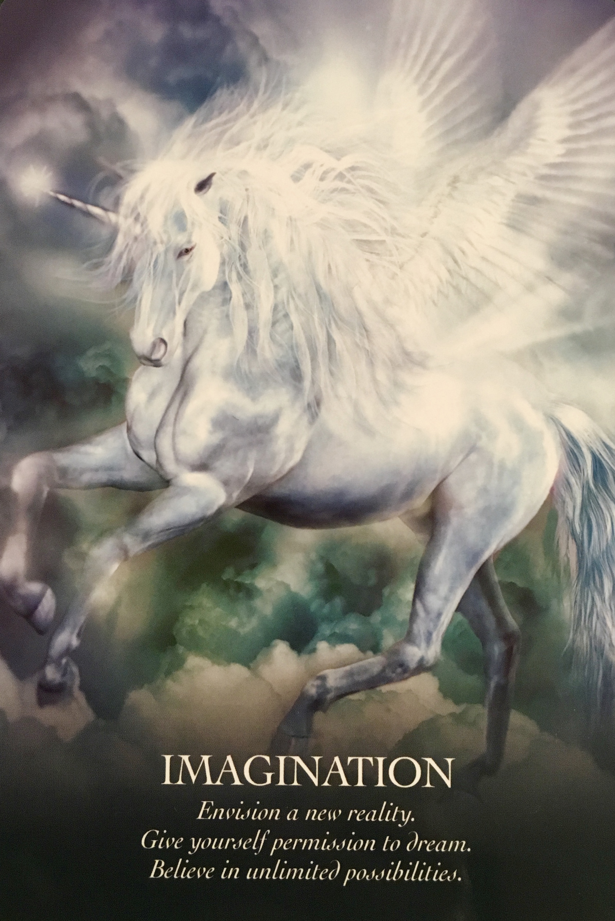 Daily Angel Oracle Card: Imagination, from the Oracle Of The Unicorns, by Cordelia Francesca Brabbs, card artwork “Cloud Dancer Unicorn” Copyright 2017 by Carol Cavalaris