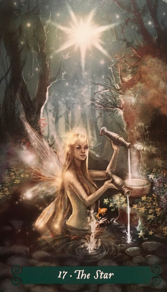 The Star: “The card of the lucky Star shows there is energy abounding for a fortuitous opportunity to arrive through which one’s hopes and dreams can be manifested. The seven-pointed Faery Star represents the harmony of Land, Water, Sky, Moon, Sun, Stars and Magic. Beneath the Star, the Goddess is revealed in her aspect of Faery Queen, pouring out the waters of life to invigorate and encourage positive changes. She opens the way and offers the chance for a joyful transformation in one’s life, yet leaves it up to the individual to take advantage of this. The card indicates that the prospects are excellent for making a change in one’s life, moving in the direction one has desired but has not yet attained.