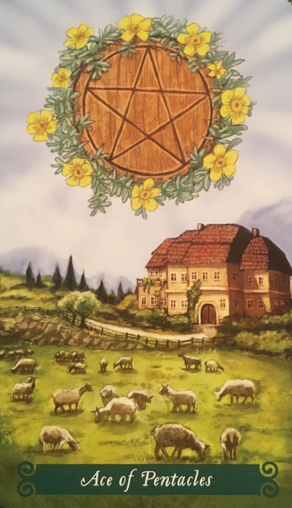 Daily Angel Oracle Card: Ace Of Pentacles, from the Green Witch Tarot, by Ann Moura, artwork by Kiri Ostergaard Leonard