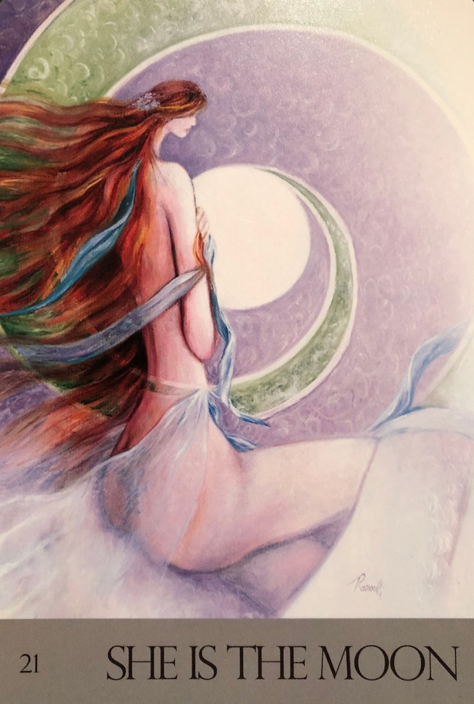 You message comes through this oracle – your manifestation is unfolding in perfect timing. If you feel something isn’t happening fast enough or is happening quickly and you are unsure if you are really ready, be assured, all is well. If something is not clear to you and you would like it to be more so, the clarity you seek will come to you. Do not worry, do not try to force the insight. Just be with what is happening now and trust. You are moving and growing and all is well. Soon you will see that for yourself, just as the moon grows full and revealing, even in the midst of deepest night.”