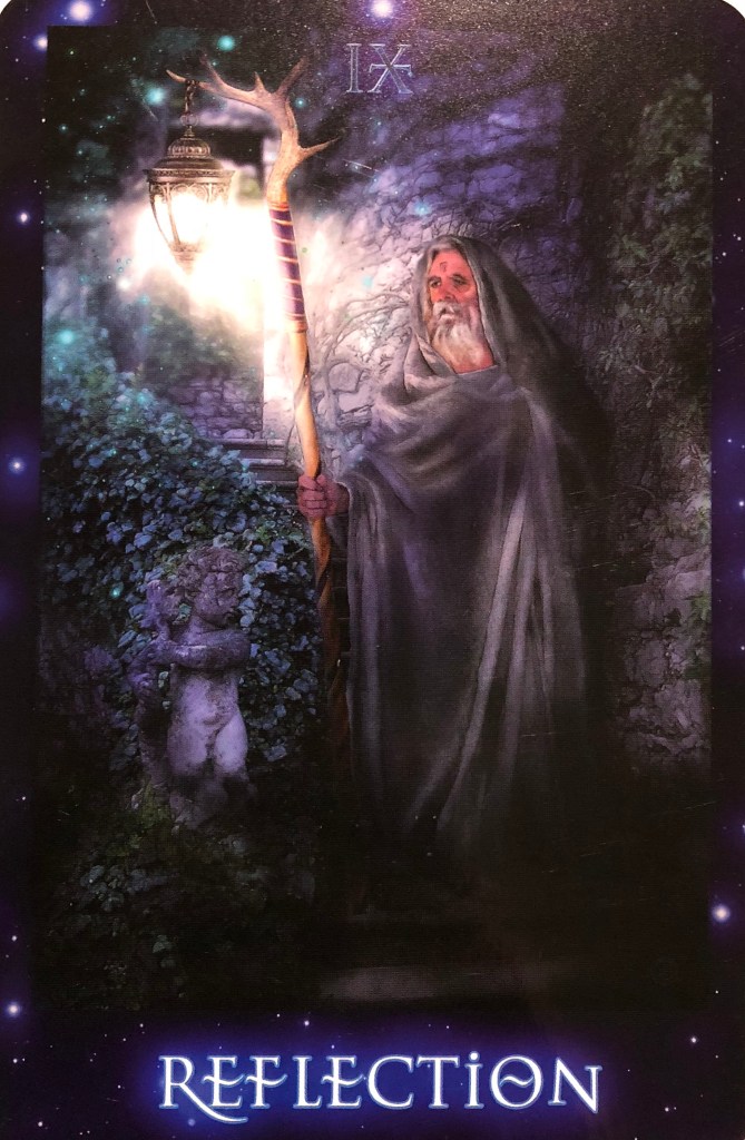 When Reflection appears in a reading, the querent might consider the following: Am I able to silence my mind and reflect on the situation at hand? How am I quieting my mind to contemplate the higher truth? Am I able to be still and listen to my inner voice? Do I need to get away, to find the guidance I need in the situation? Have I matured from what I have learned? How am I behaving like a hermit to those who seek my attention or guidance?”