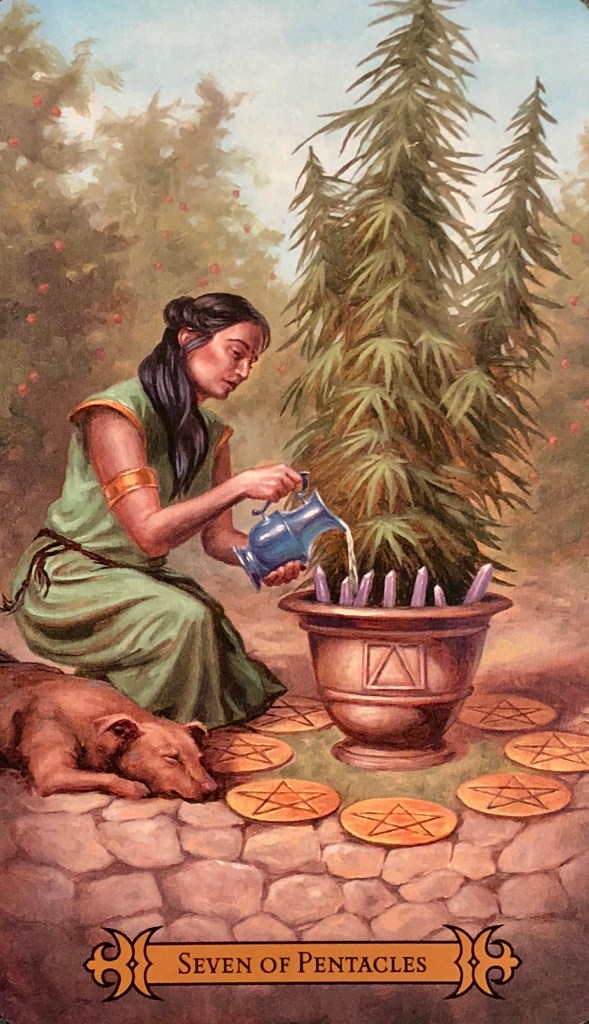 Daily Angel Oracle Card: Seven Of Pentacles, from the Modern Spellcaster’s Tarot, by Melanie Marquis, artwork by Scott Murphy