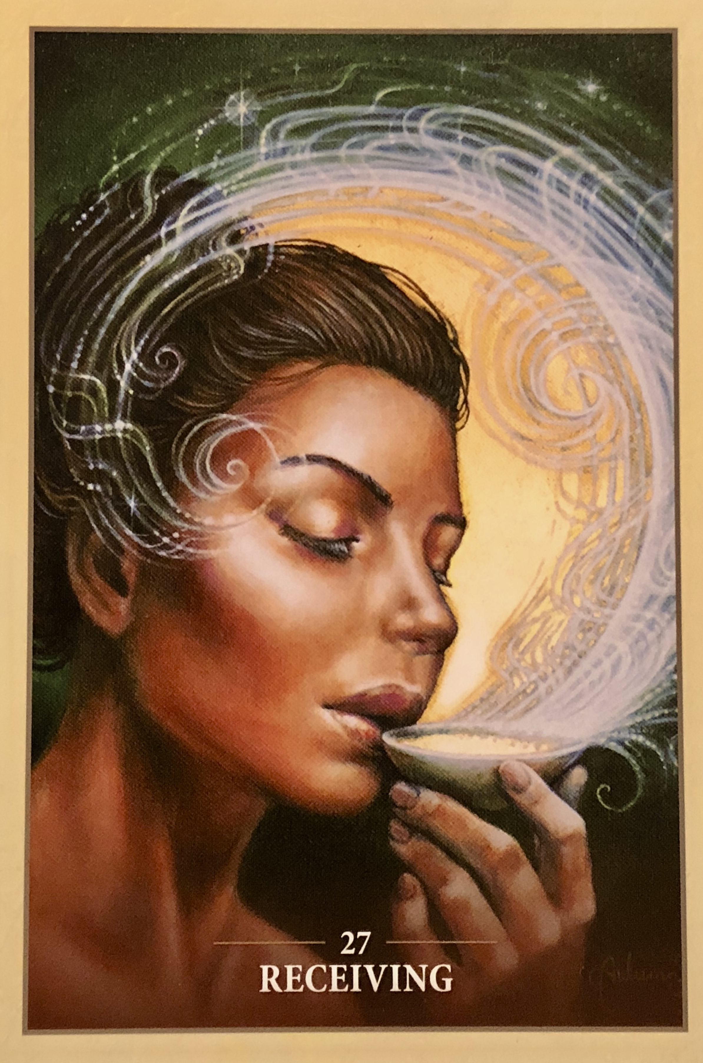 Receiving: “You are so loved. Your every need it witnessed and responded to by the universe. However, you sometimes forget this. You become swept up in the momentum of habitual consciousness, and you forget to take a moment to stop, breathe and be. In that moment you can receive the love of the universe that is receiving you. It will nourish you with contentment and energy.