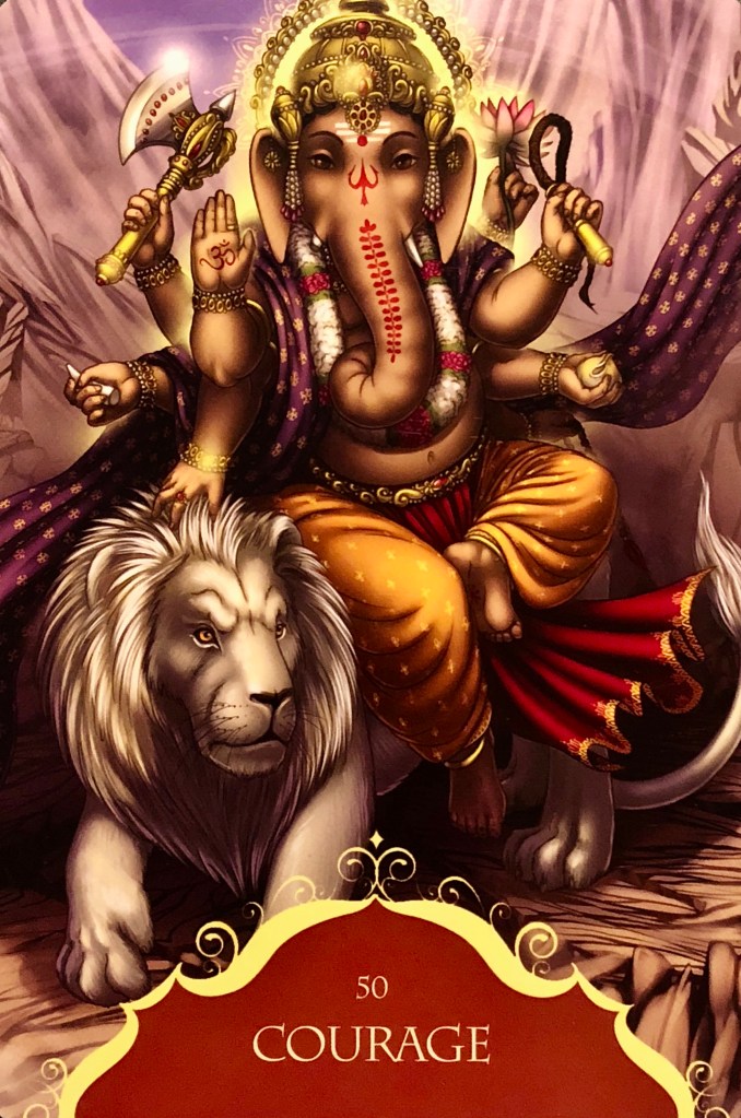 When you draw this card, it is a sing that your ability to cooperate and thrive in peer ventures with like minded individuals is heightened. Be willing to do what is needed for things to run smoothly for you. Ganesha promises great success if you are willing to let down your walls. He is picture here on the powerful lion, inherited from his mother Parvati. The lion represents the fierce nature of Ganesha. He calls on you now to trust the fearless part of your being, your own inner lion, and invites you to work with him to learn how to be valiant and harness your heart’s great courage.”