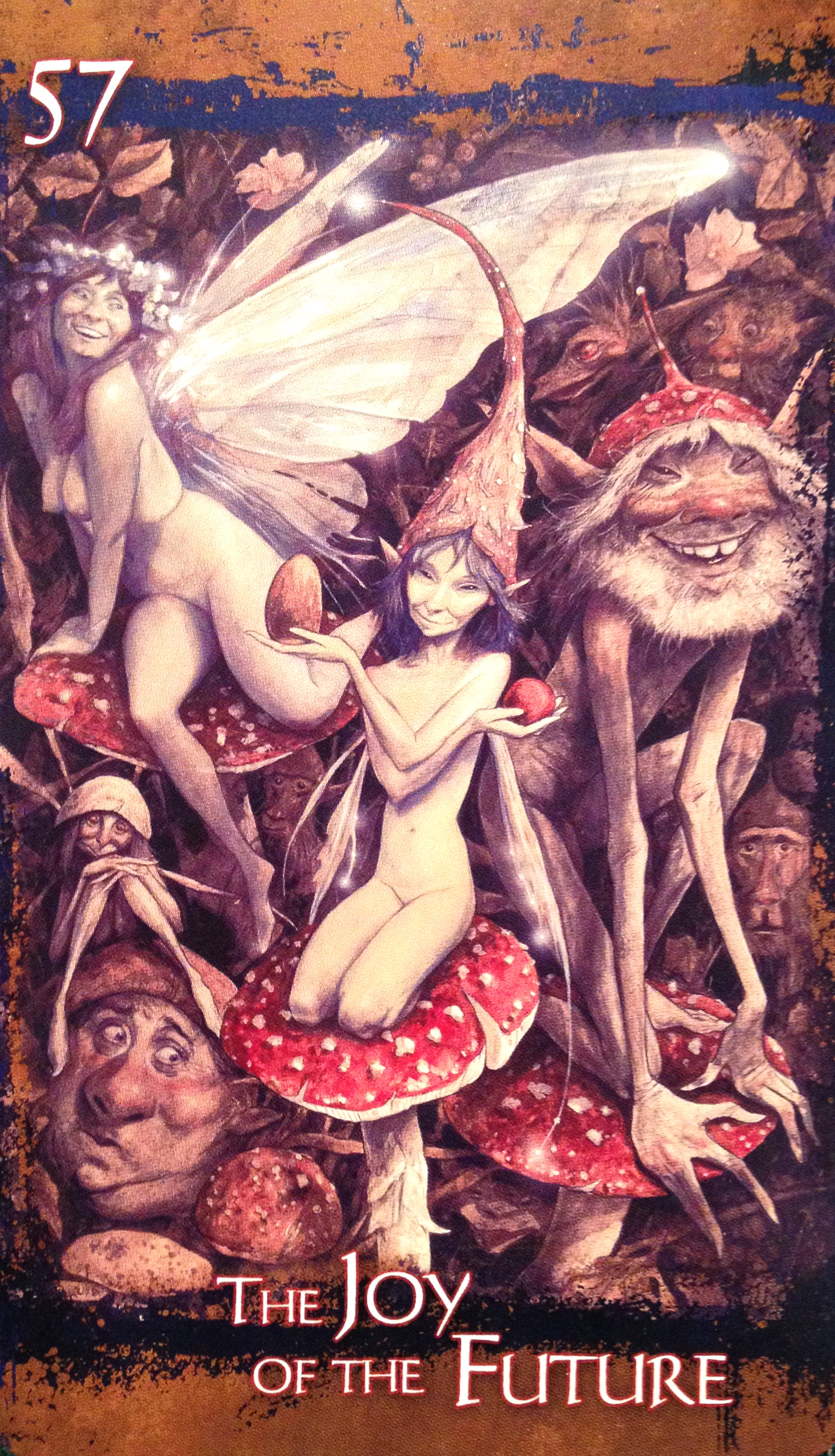 “If you look at The Joy Of The Future, you will see that it is full of possibilities. The pixie holds nuts capable of turning into trees and the other beings are filled with joyful anticipation, ready to jump into whatever the future holds for them – except for the little man in the left hand corner. See how worried he is?