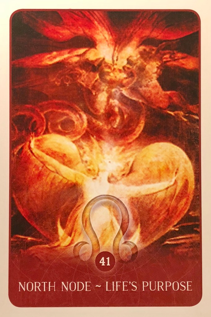 North Node Card in Brief: “Life’s purpose; the soul’s enlargement; balance; karmic rewards and karmic bonds; memories of previous lives; reinforcement; support; movement forward; being right; the pot of gold at the end of the rainbow; undiscovered talents; fulfillment; the things we can fall back on; being in the flow; trusting destiny; meaningful exchanges; inner balance; the foundation for future success; achievement; giving credit; considering the other side; working with others; emotional security; the path of least resistance; adaptability; inner strength; playing games; wisdom; trust; working well with youth; understanding children; optimism; a stroke of good luck; generosity; charity; wealth; the color deep red; kind authority; the exploration of ideas; expansion and growth.”