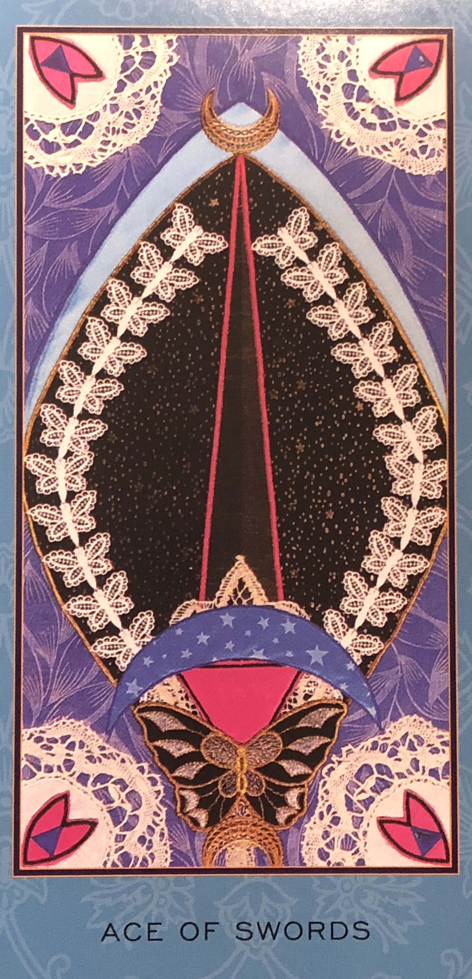 The Dream: “Under an azure sky in the Realm of Air, the forces of truth and justice have triumphed. The message of the raised sword is that adversity and doubt can be conquered through effort. But the element of the suit of Swords is Air – the element of ideas – and so this victory also represents the power of the mind to prevail over uncertainties. Twenty-two white butterflies symbolize that all resources have been joined to reach the pinnacle, the sword’s point. The waning and waxing crescent moons as the sword’s base and tip, respectively, show that a completely new phase of action is beginning; this is a phase of expansion. The large butterfly at the bottom of the card symbolizes the ability of ideas to move through the air. In the corner are four shields representing the protection afforded by mental powers. Behind the sword is a shape resembling a spade, the unifying background shape on all the cards of The Enchanted Tarot’s suit of Swords.”