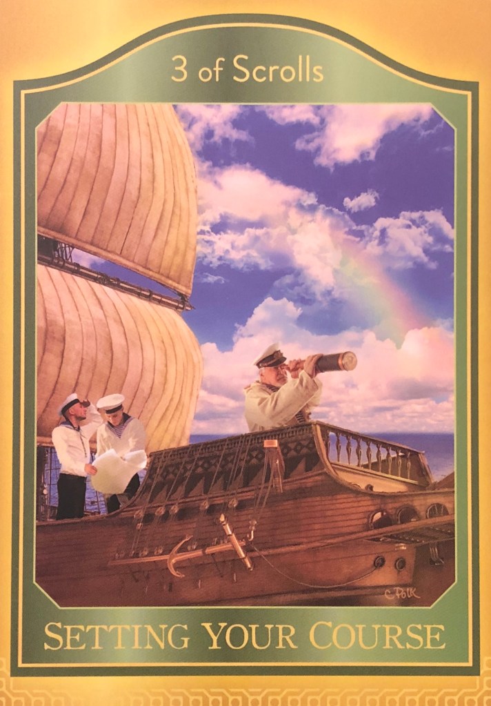Special Note: “The captain’s telescope shows the way to more information in a neighboring card. Whether upright or reversed, the card to which the telescope points reveals the supporting influences or obstacles as you chart your course. That card may also provide insight into events, people in your partnerships, and even travel or relocation plans. So let the telescope give you a closer look.”