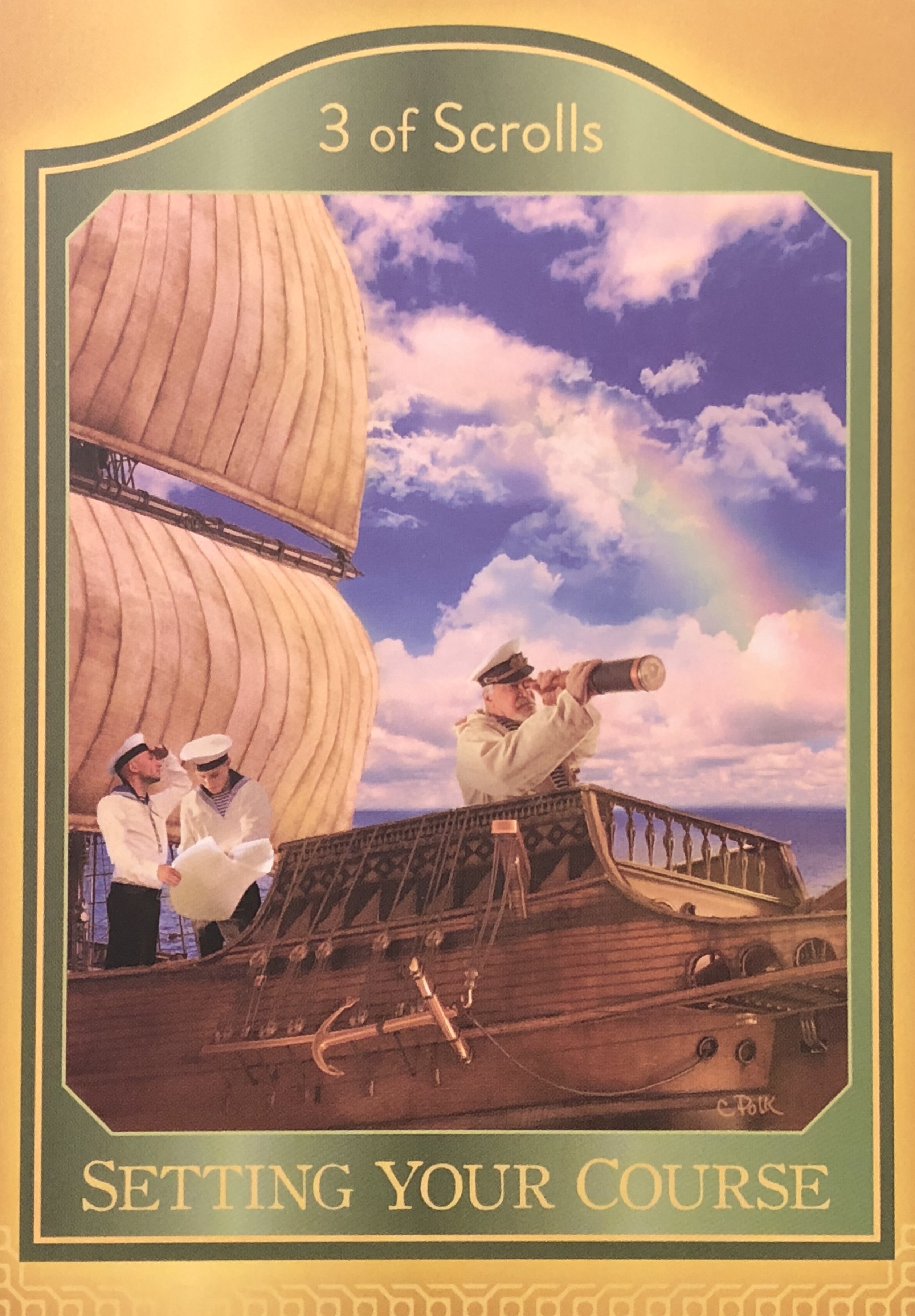Special Note: “The captain’s telescope shows the way to more information in a neighboring card. Whether upright or reversed, the card to which the telescope points reveals the supporting influences or obstacles as you chart your course. That card may also provide insight into events, people in your partnerships, and even travel or relocation plans. So let the telescope give you a closer look.”