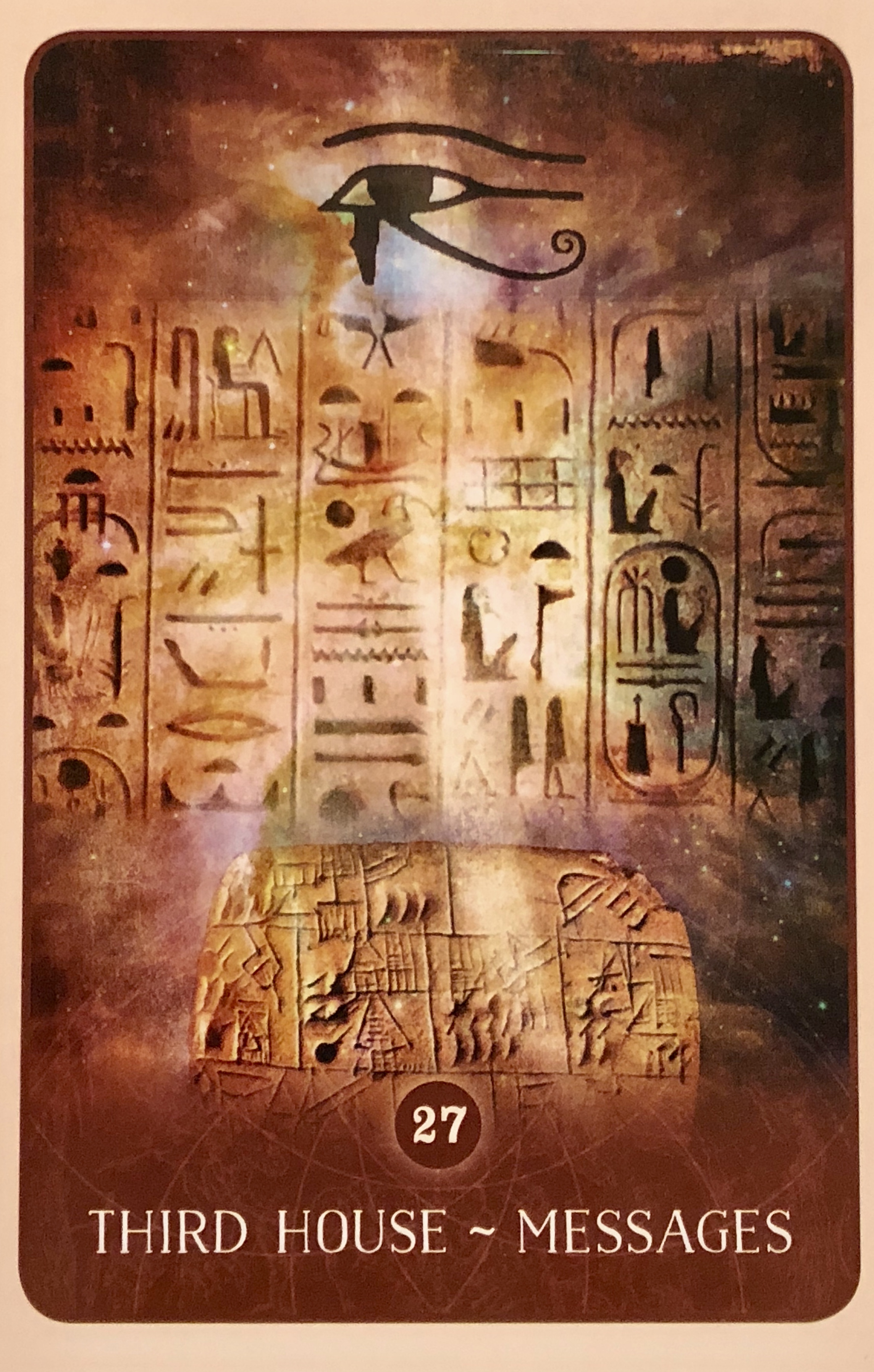 Third House Card In Brief: “Finding the right words; discussion; being of two minds; vacillation; hesitation about stepping into situations; coming to clearer choices; objectivity; short trips; air travel or taking flight; mastering something new; neighborhood events or changes; connecting to the greater mind; owning what you know to be true; being chatty or talkative; closing down emotionally and relying on common sense; turning cold on someone, or someone turning cold on you; hand to eye coordination; games, and figuring out puzzles; intelligence; inventions; numbers and letters; needing to do math; early schooling; scripts; codes; siblings; bargains; signing of contracts; sales and commercial transactions.”