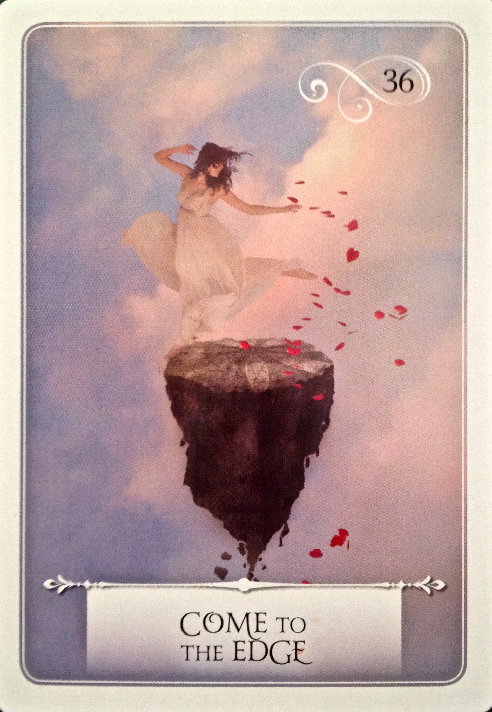 The Oracle’s Message: “Facing the unknown is the only choice you really have right now if you want to progress. It is Ok to be afraid. Now is the time to take a risk that is not calculated – to feel the exhilaration as you ready yourself for a leap of faith. Spirit is present, so let go of fear. You are called to express your true self. Listen to your heart and soul, not your head. Come to the edge and discover that you can fly. You must step into the unfamiliar so that you may find your miracles.”