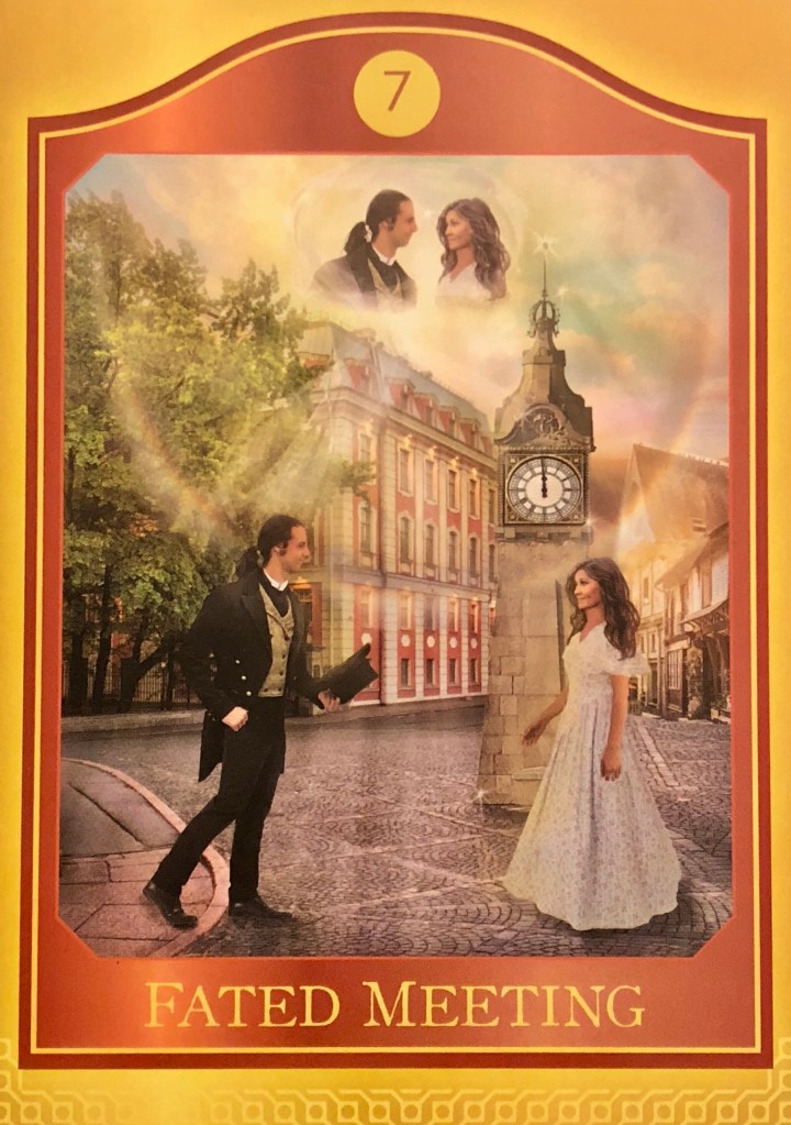 Fated Meeting: “A clock tower stands with its hands pointing to just a few minutes before 12:00. A man and a woman approach each other, coming to meet at the time that was predetermined by their Higher Selves, who are shown above them, translucent and shining.