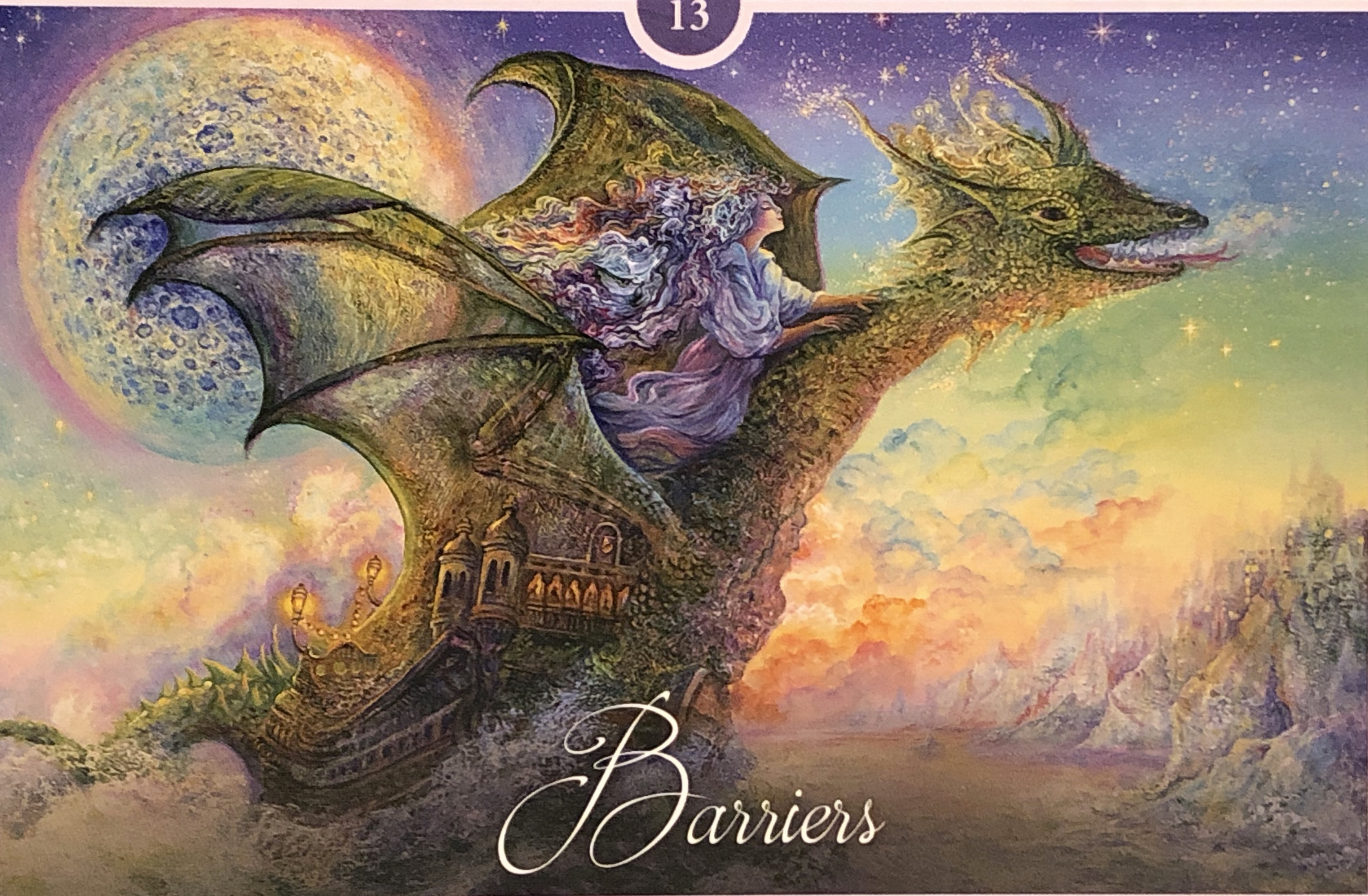 A woman rides high on the back of a dragon in the middle of the ocean. The shoreline is covered with jagged rocks and looks completely unapproachable. Smoke comes from the dragon’s mouth as if he might breathe fire at any moment. You have created a similar type of energy with the walls you have built around you. Remember, fear does not keep you safe. Be willing to make some changes. talk to someone about what you are harbouring so your healing process can begin. The full moon shines her light on whatever it is you are ready to release. The turbulent water shows this may not be easy for you to do. However, the same turbulent water can be cleaning and will help you to move forward. The stars in the sky are your blessings. They suggest there are many sources that will help you to become free.”*