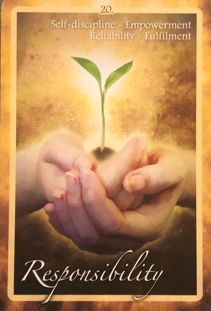 Card Message: “Responsibilities and self-discipline are vital in creating all the things we want in life, from a healthy body and mind, though to a successful career and happy relationships. This card is an invitation to smile at the opportunity to fulfill your responsibilities.