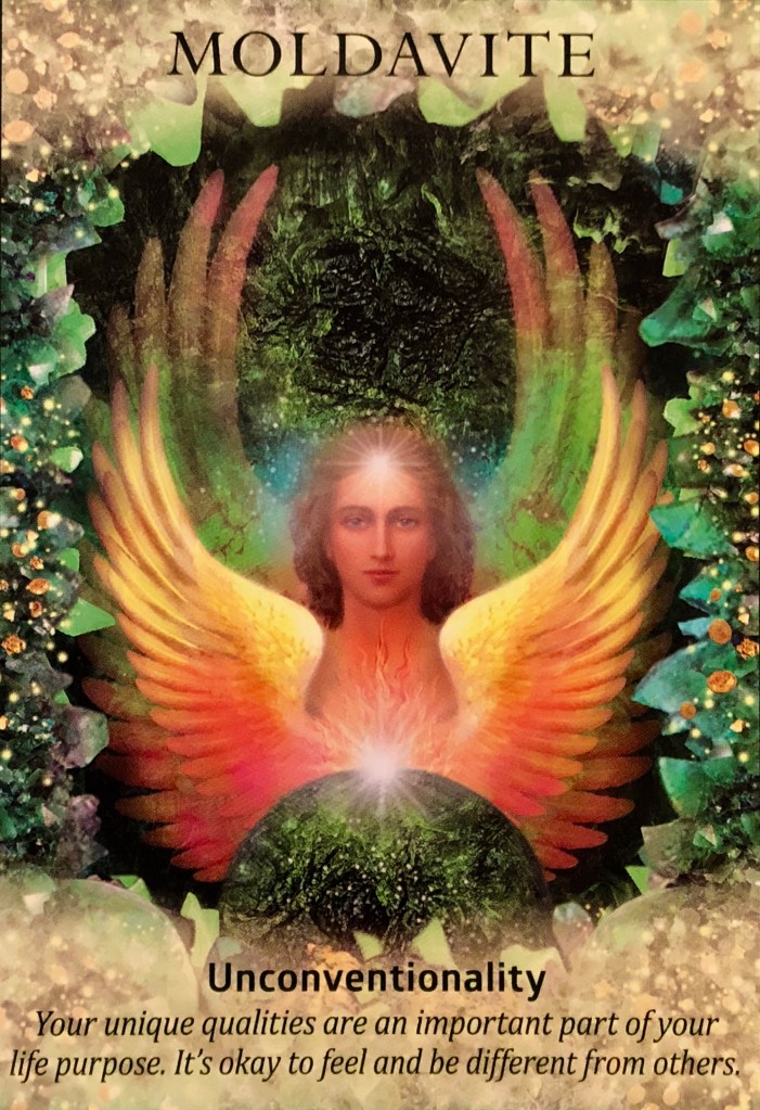 Daily Angel Oracle Card: Moldavite, from the Crystal Angels Oracle Card deck, by Doreen Virtue, Artwork by Marius Michael-George