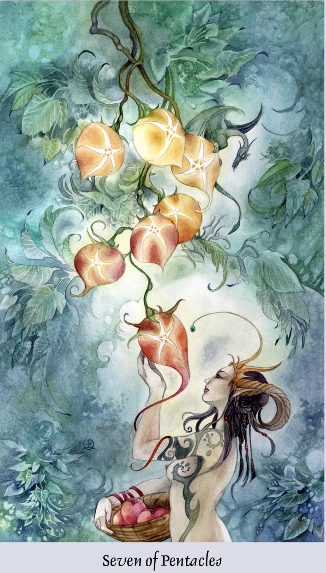 The Seven Of Pentacles challenges you to make a choice: to eat and enjoy the fruit in the basket, or to leave them to flower and ripen and continue upon the branch? It is about reaping the reward for effort and work. The seeds have been sown; the time of work and waiting has passed. They have grown and come to fruition. Now is the moment to appreciate. It is a calm moment of consideration of alternatives and different approaches.”*