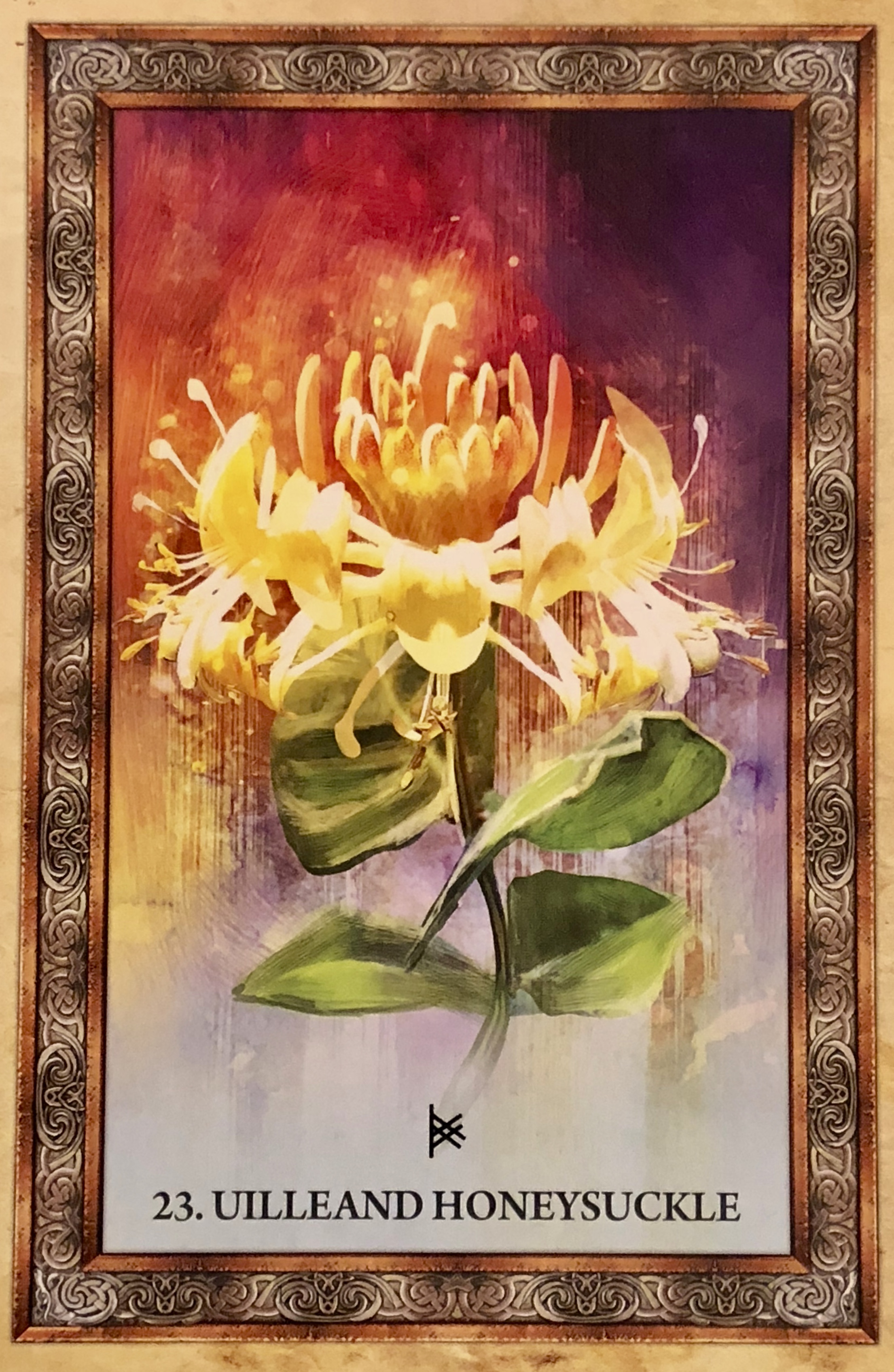 Uilleand Honeysuckle In A Reading: “Uilleand Honeysuckle in a reading has to do with the search for inner knowledge. This flowering vine helps us discern false from true and choose that which is worthwhile. This woodbine is an ally. It provides protection and reminds you to stay true to yourself. Although you may find many distractions as you travel your path, this vine symbolizes a focused journey into the self and the soul. It signifies your spiritual journey and encourages you to keep learning, expressing your true nature, and evolving.