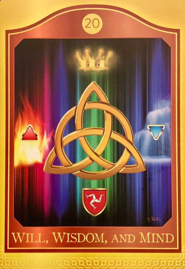 Nonetheless, the Coat of Arms of the Isle of Man flies high, sharing its message that however you land, you will stand – even in these difficult times. So take a step back and don’t try to fight the forces at hand. Get out of your head and do what you can to reconnect with your higher guides. Your outer influence may be diminished right now because your crown has been toppled. But your strength and authority have now become the foundation upon which to build anew. You can bring mental, emotional, and physical balance back to your life by working with the exquisite and powerful energies depicted in this card. The more you become aware of these forces within you, the sooner the right flow of energy will return.”