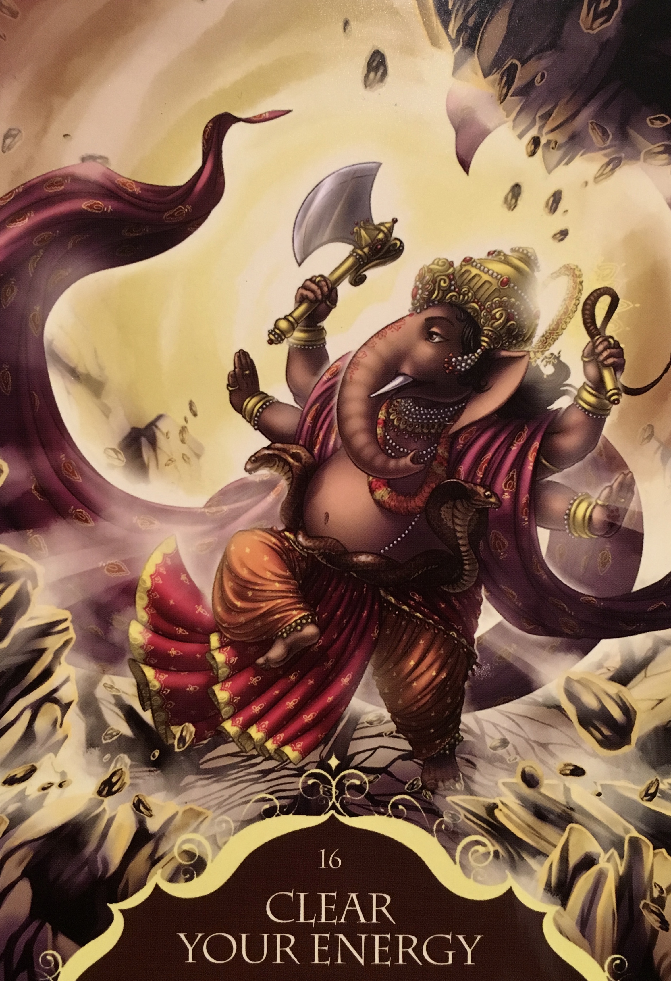 Clear Your Energy, from the Whispers Of Ganesha Oracle Card deck, by Angela Heartfield, artwork by Ekaterina Golovanova