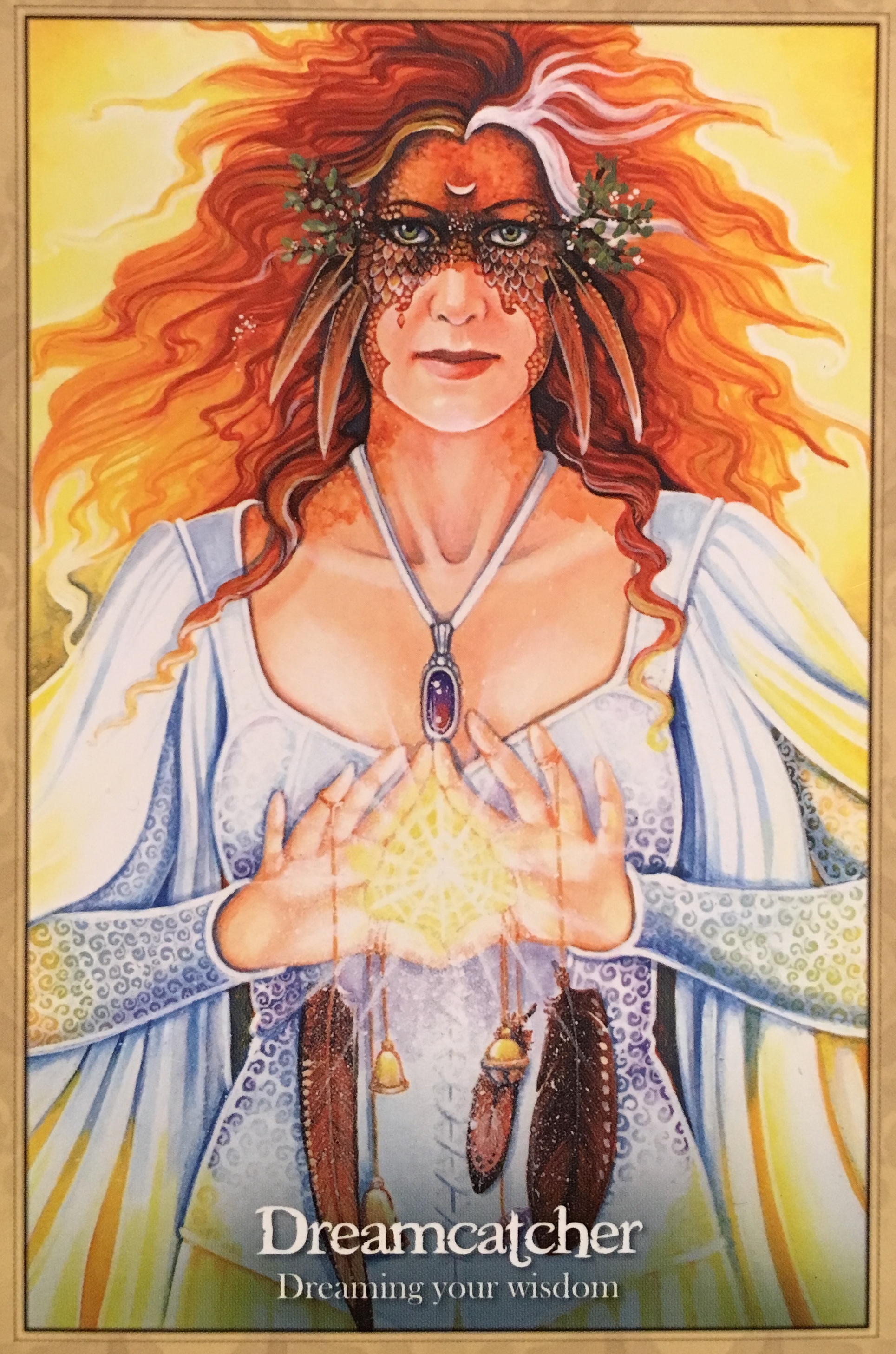 About Dreamcatcher: “The import of dream oracles has been spoken of in many ancient cultures, from the Greeks to the Lakota, from the Celts to the Norse. We are all being given chances to learn and to dream into being the truth of who we are while we do this thing called sleep, in which our being is trained and worked with in the spirit world. The Dreamcatcher being will come to you as the teacher you need, holding the sacred feather of the air, the bells which will be rung by the Dawn Watcher and the threads which woven together create your perfect and knowable and unknowable destiny.”